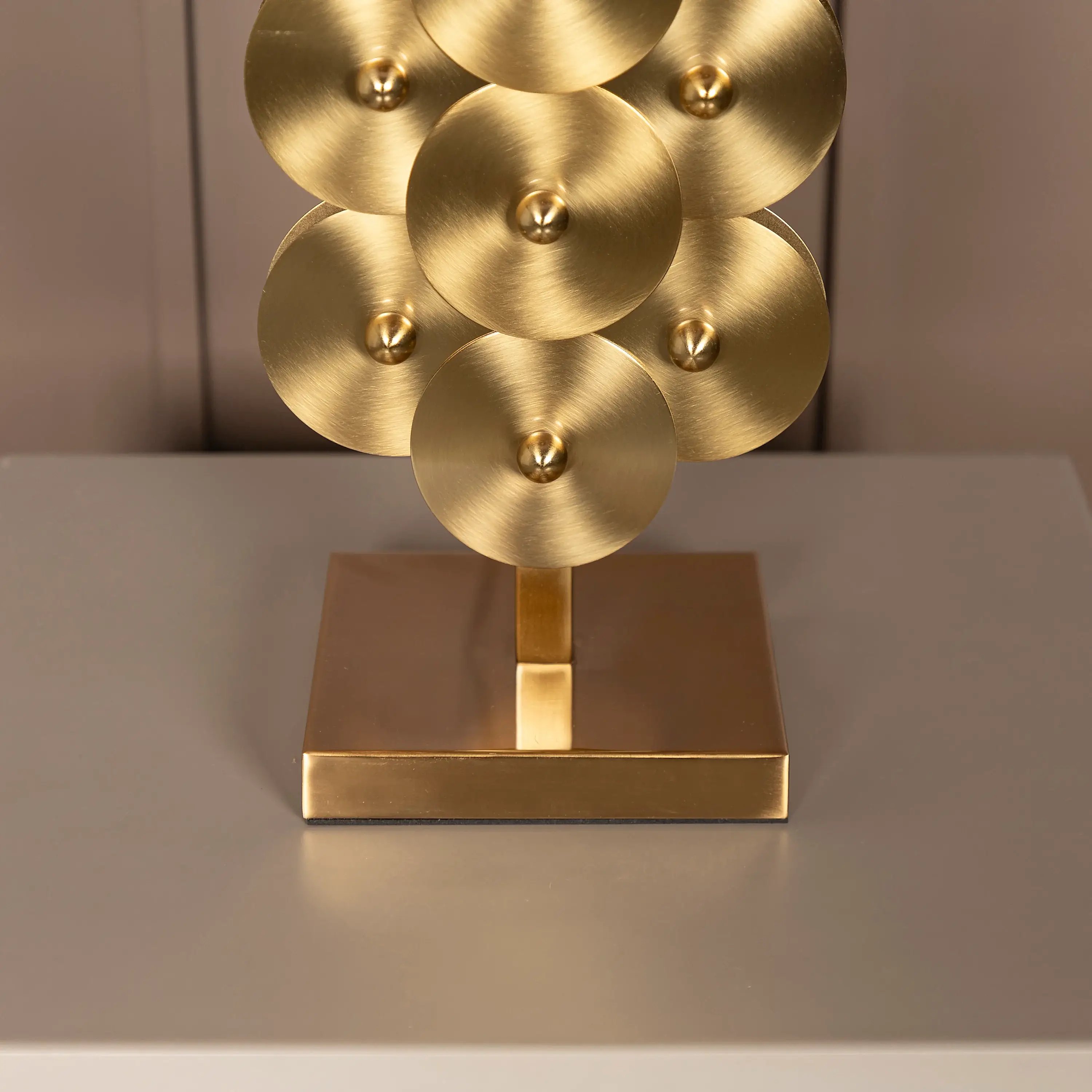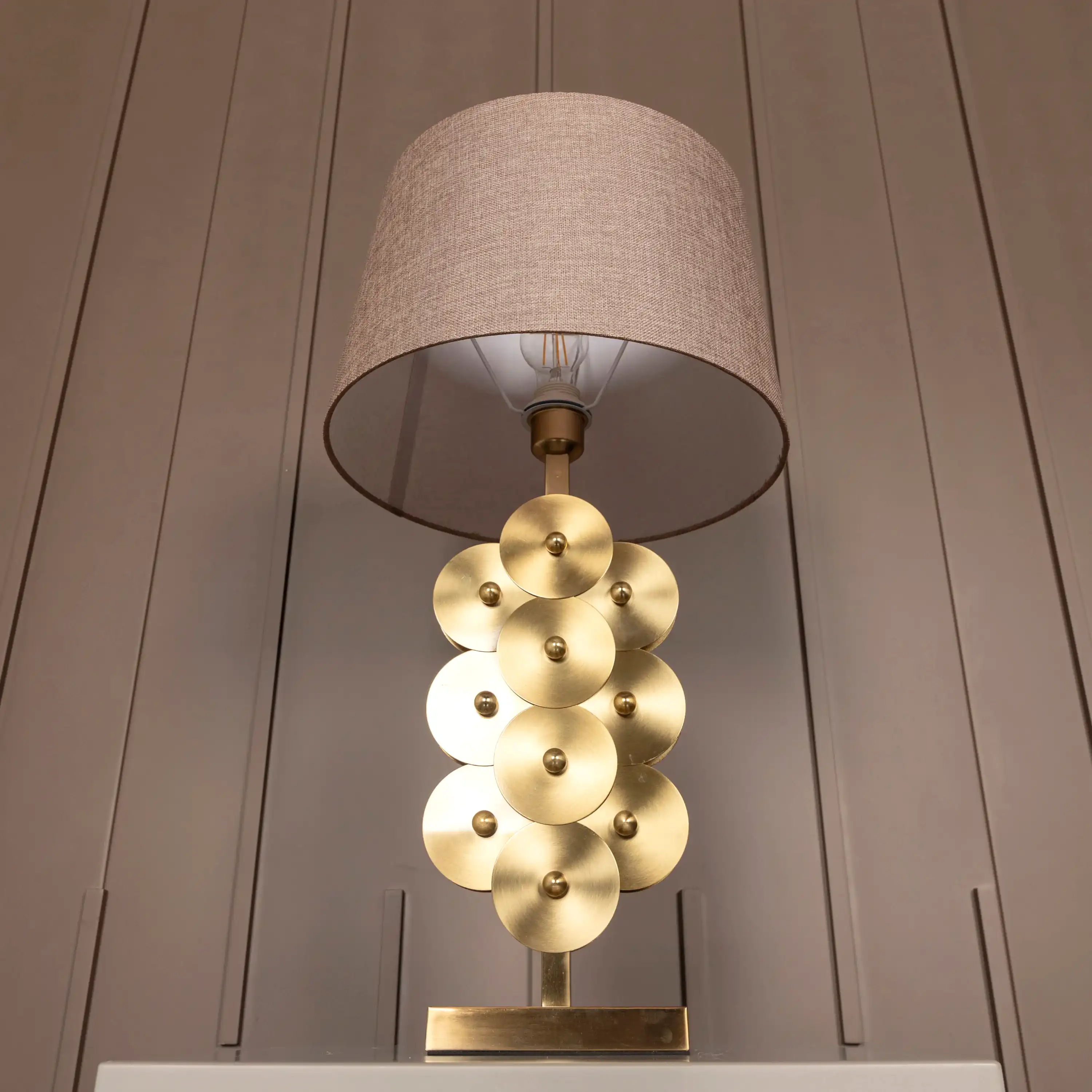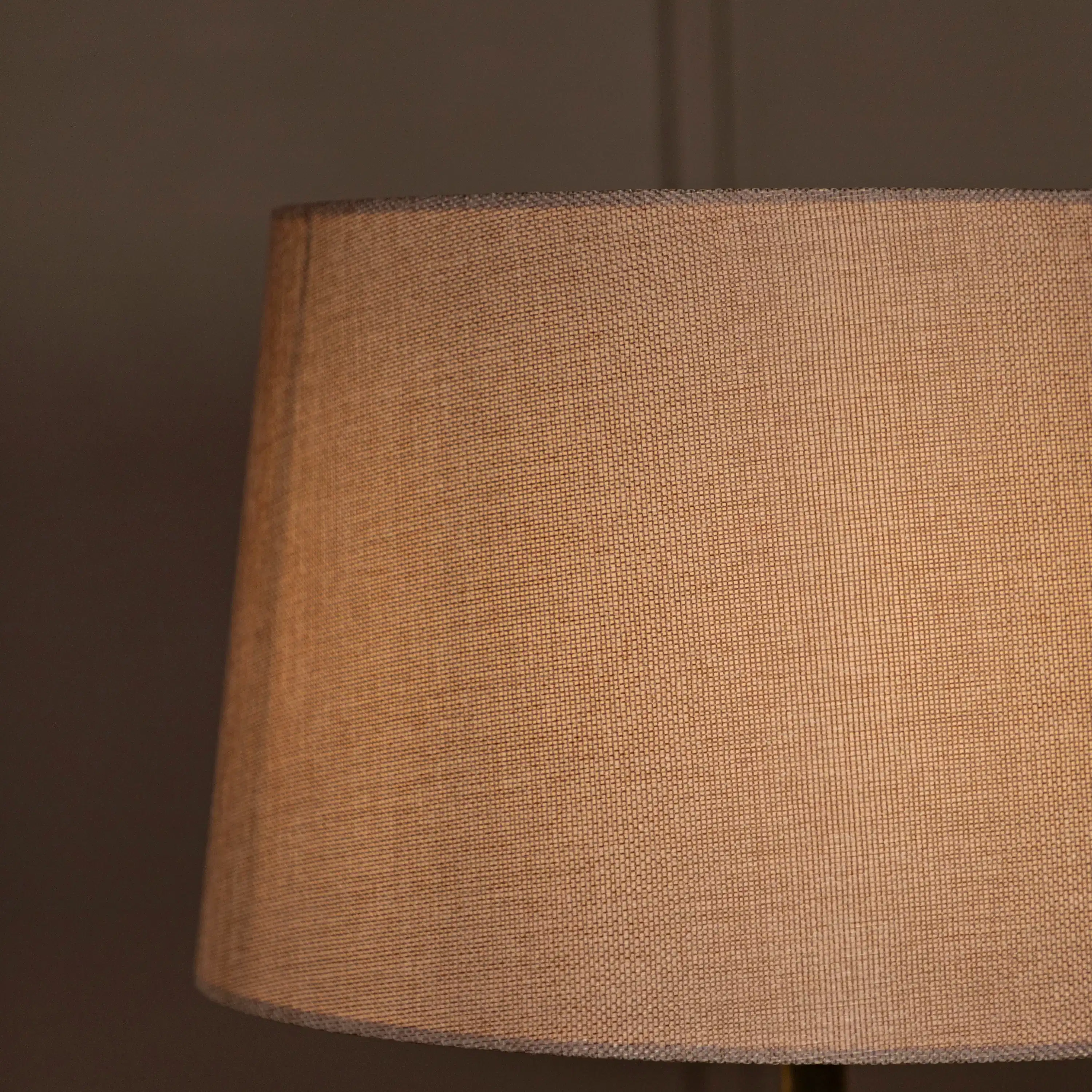 E27 duy sisteminden yayılan ışık, kahverengi kumaşın içinden nazikçe süzülerek ortamda huzurlu bir loşluk yaratır. Nice, hem dekoratif hem fonksiyonel bir obje olarak mekânların ruhuna katkıda bulunur.