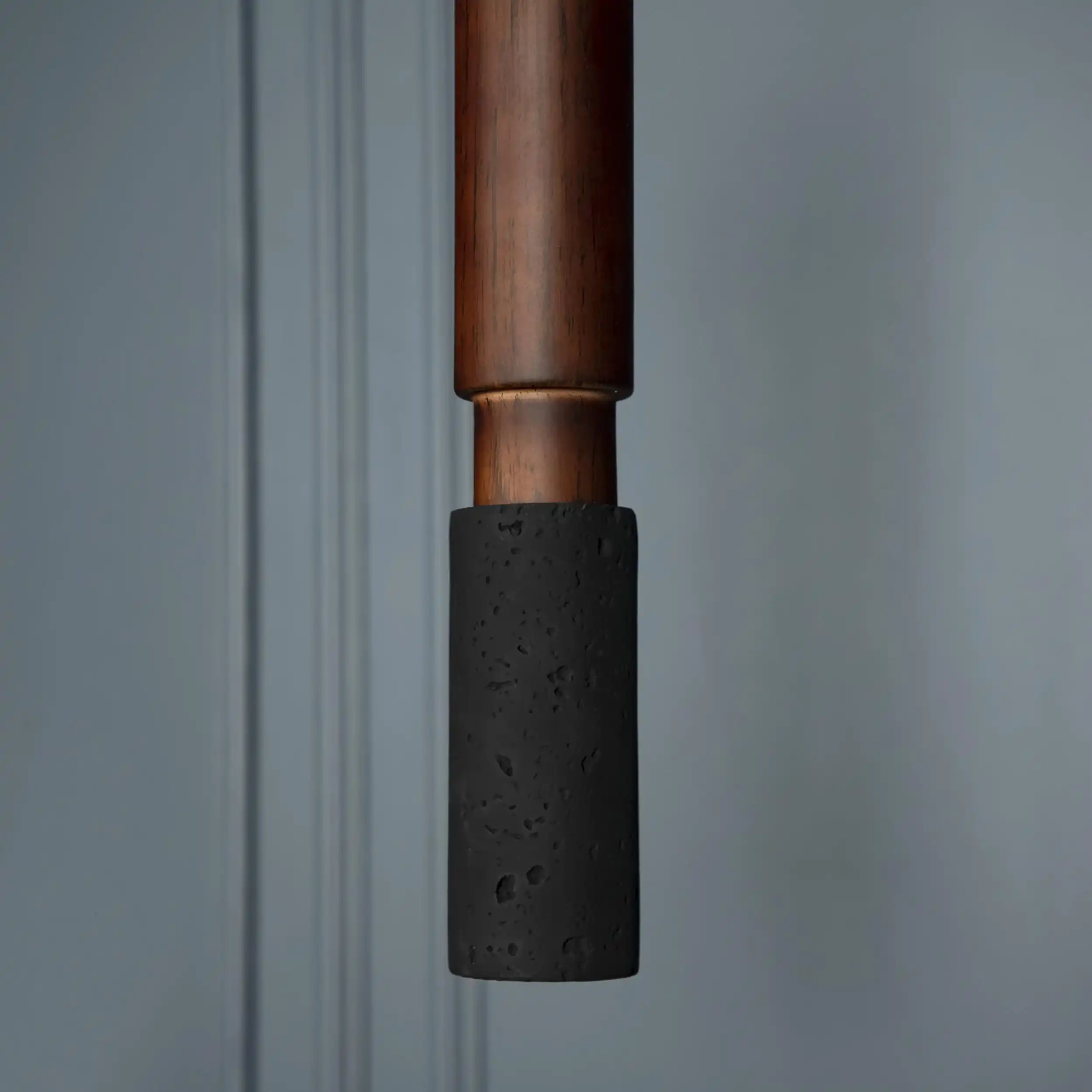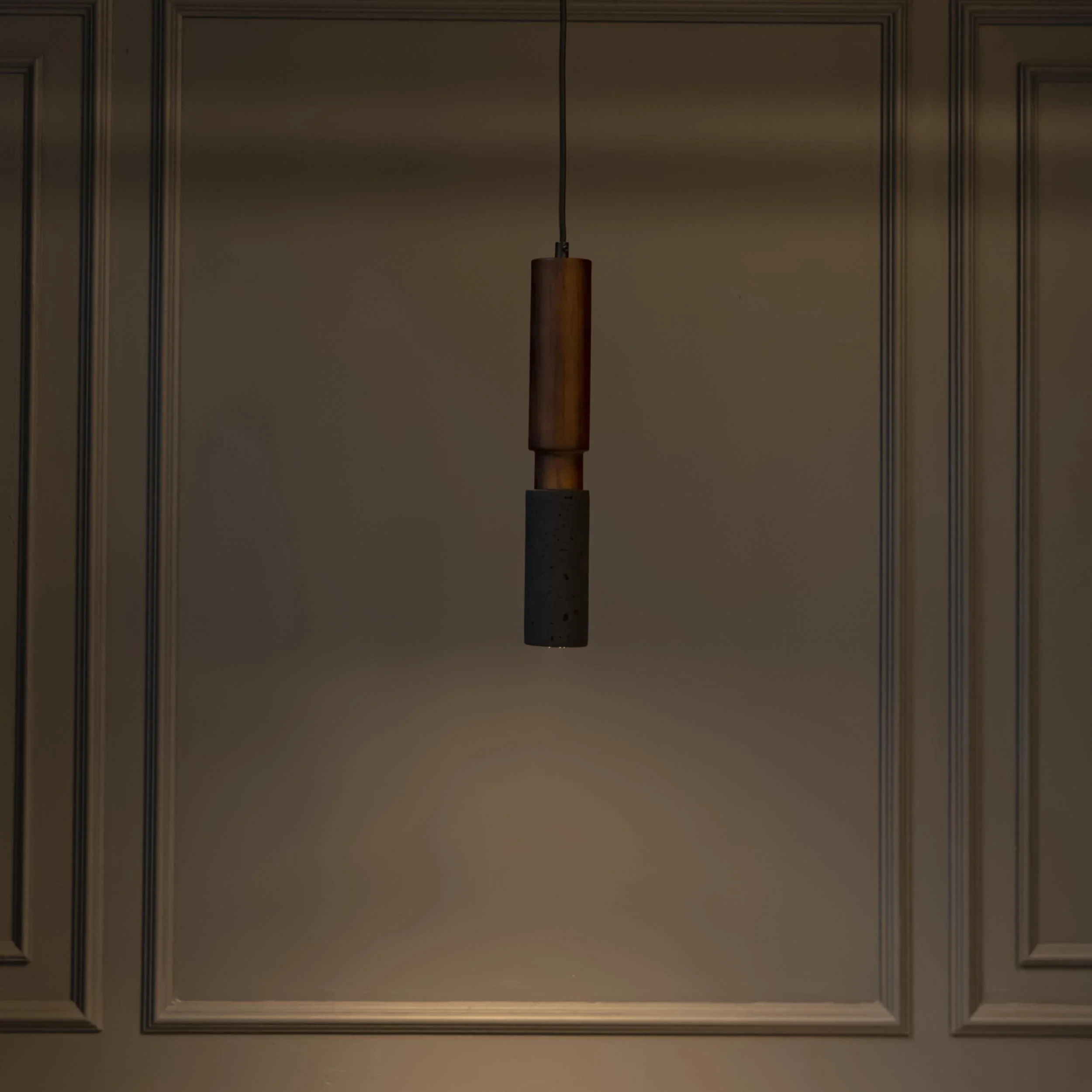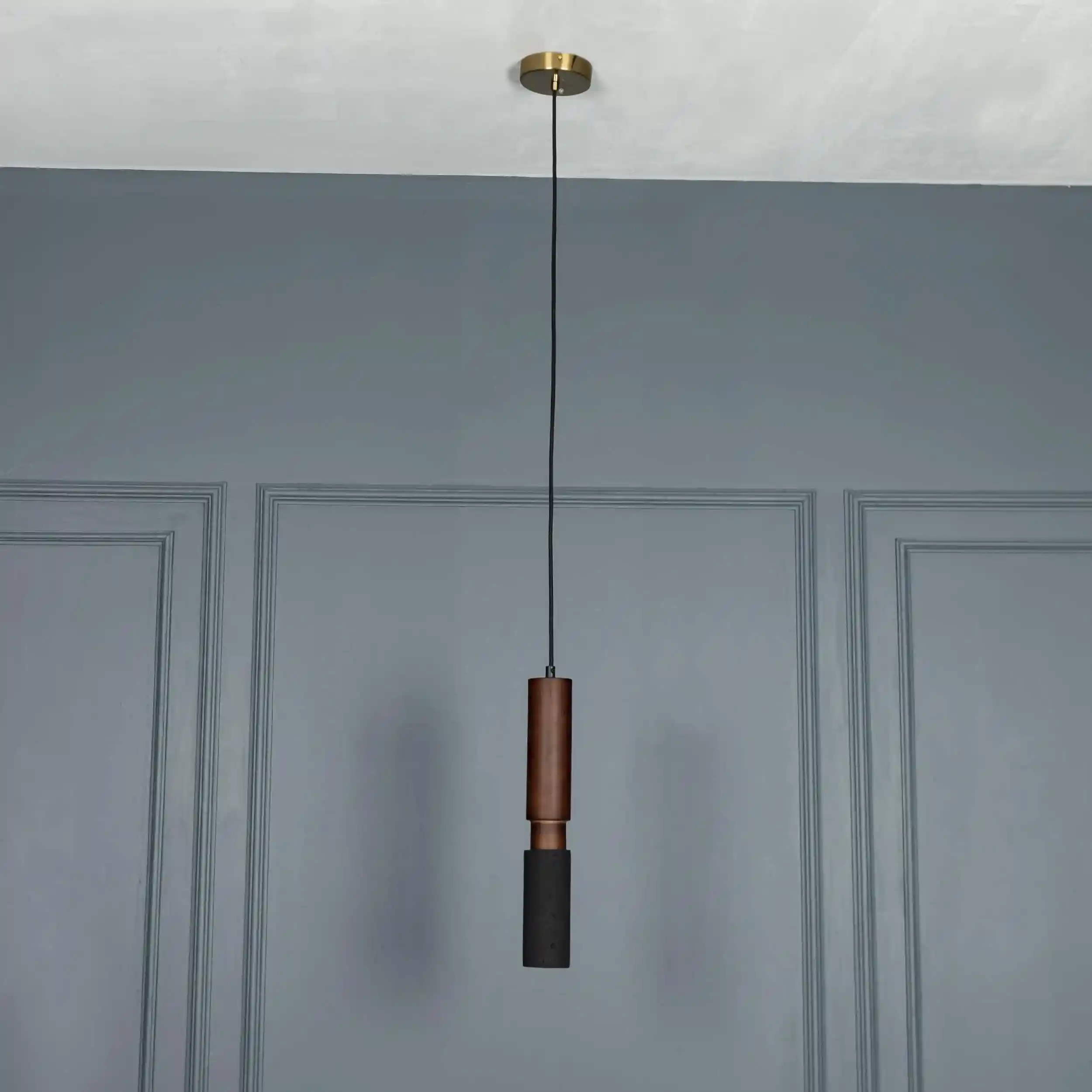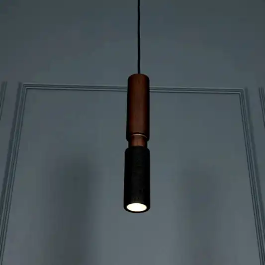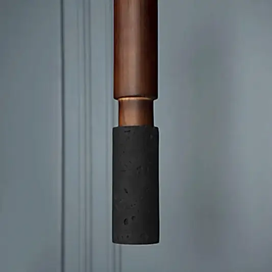 Kovak Sarkıt Avize, doğal siyah beton yüzeyi ve koyu kahverengi metal detayıyla, modern endüstriyel tasarım anlayışını sofistike bir stille buluşturur. İnce silindirik formu, yukarıdan aşağıya geçiş yapan renk kontrastıyla tamamlanır; bu da avizeye hem yalın hem çarpıcı bir karakter kazandırır.