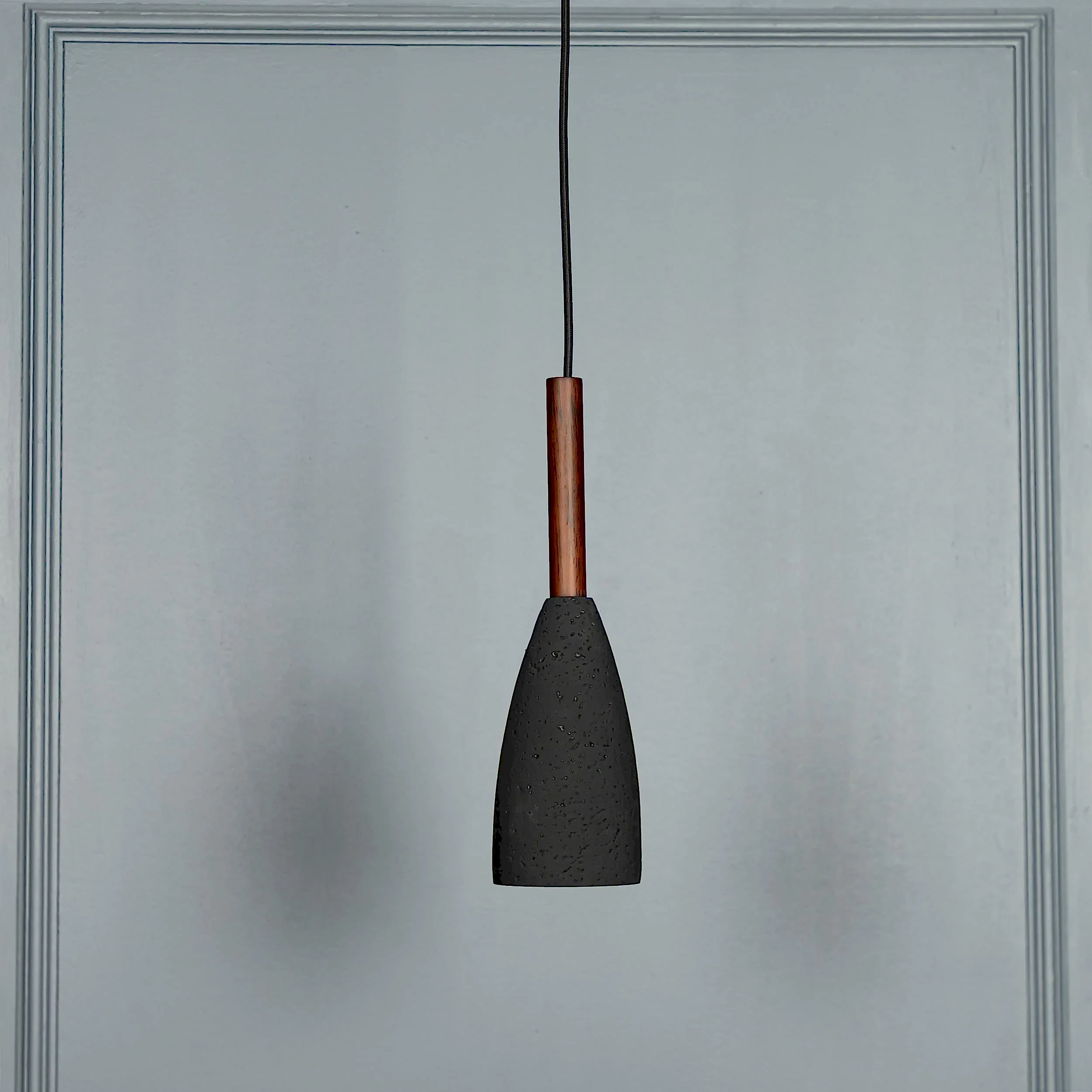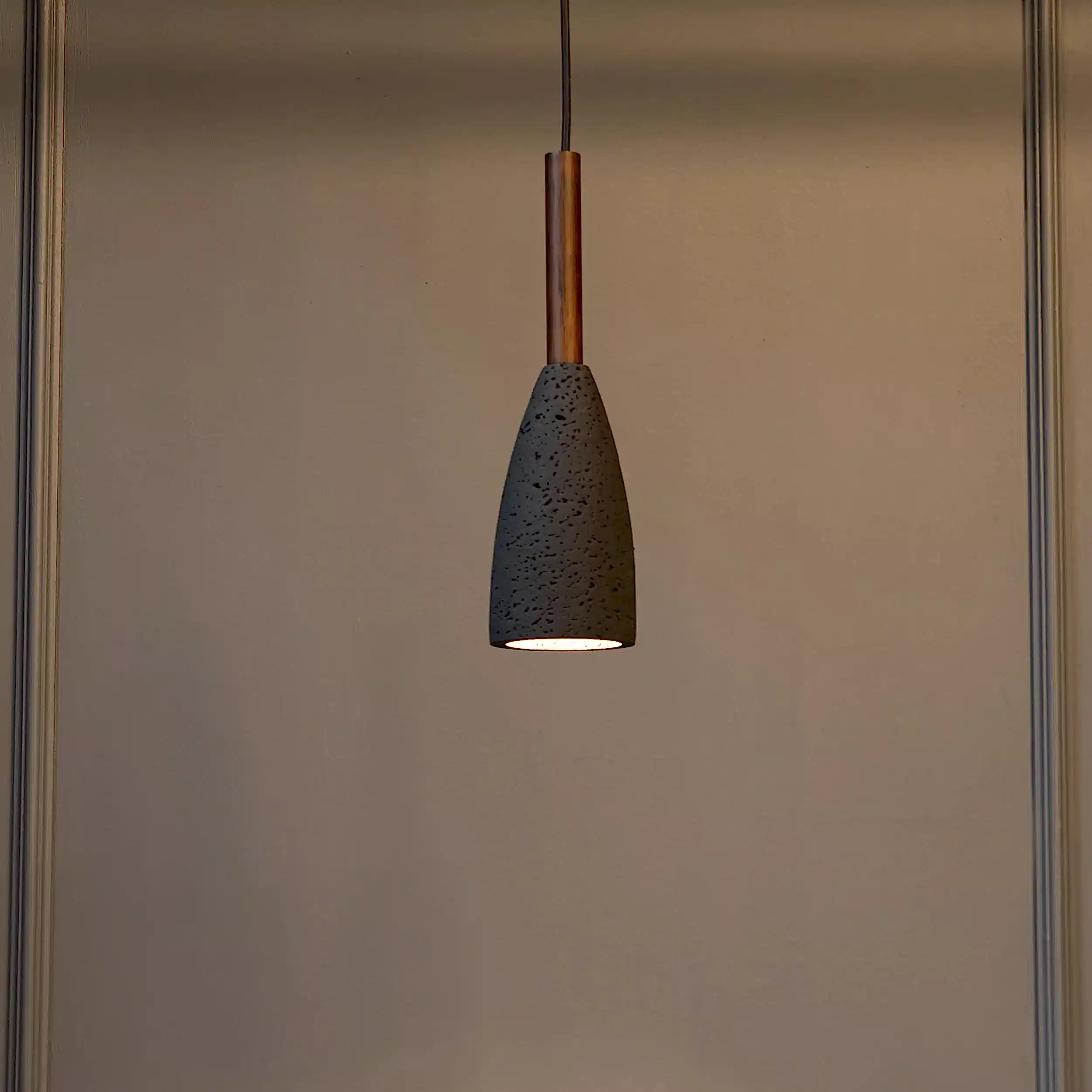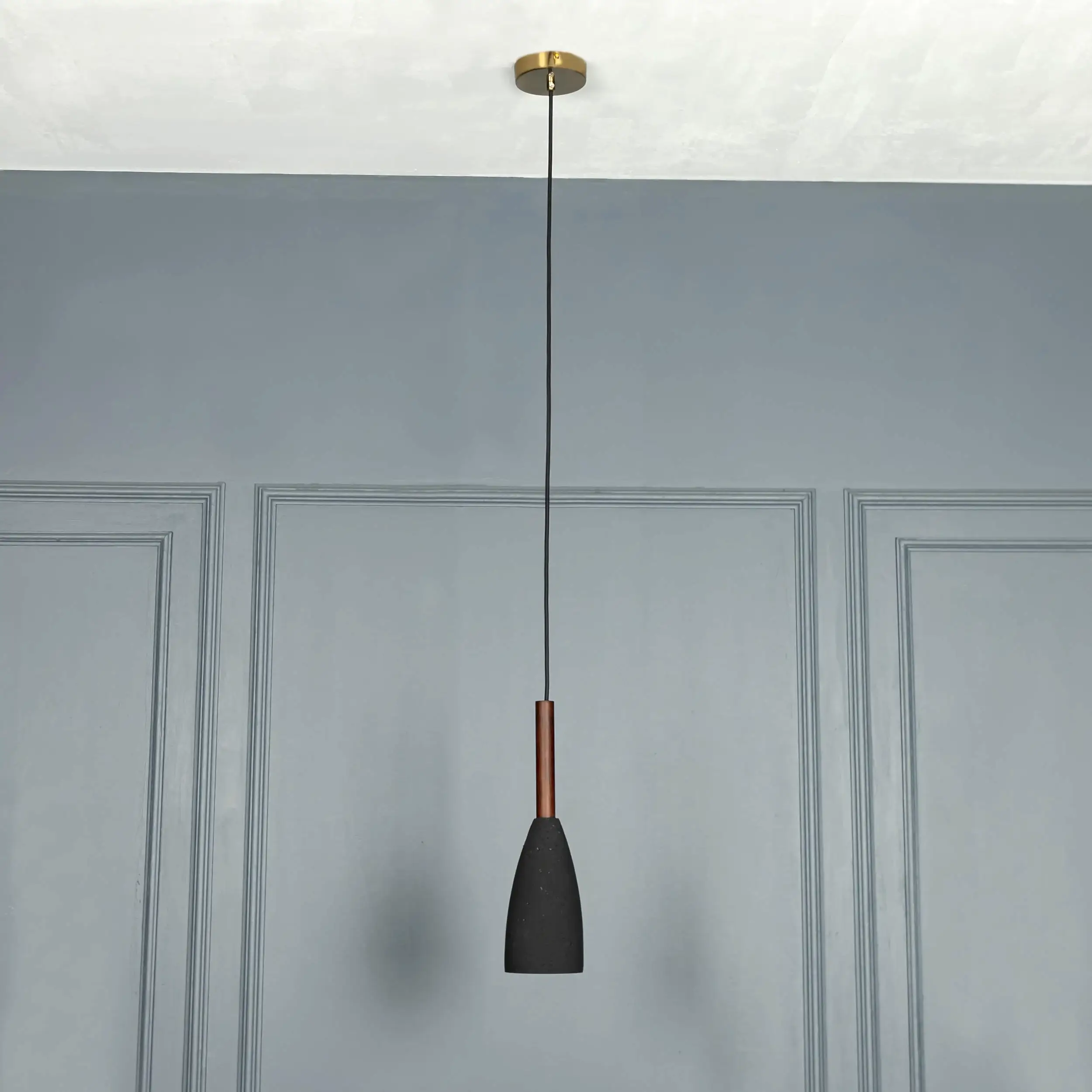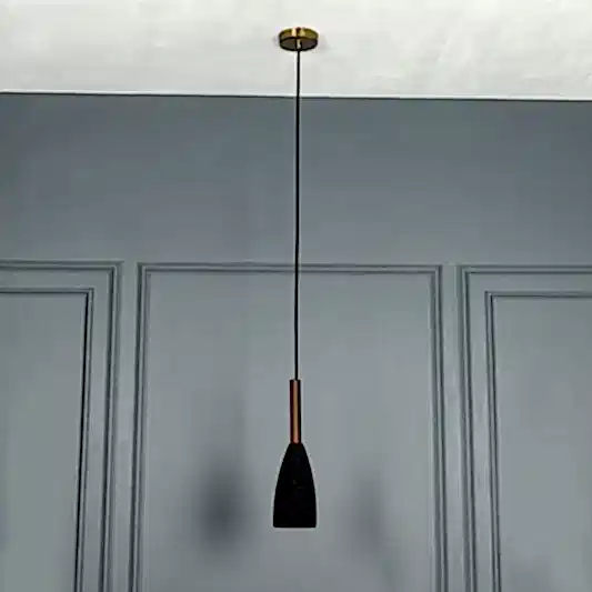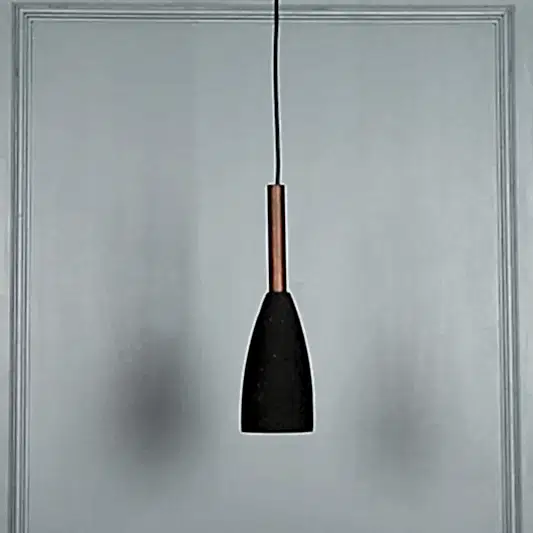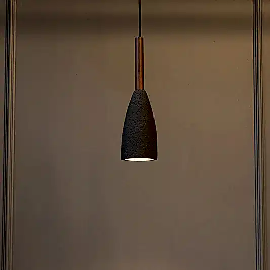 Zada avize, siyah beton gövdesi ve kahverengi metal detayıyla sade, modern bir şıklık sunar. Koni formundaki tasarımı, doğrudan ve odaklı aydınlatma sağlayarak mekanlara net bir atmosfer kazandırır.