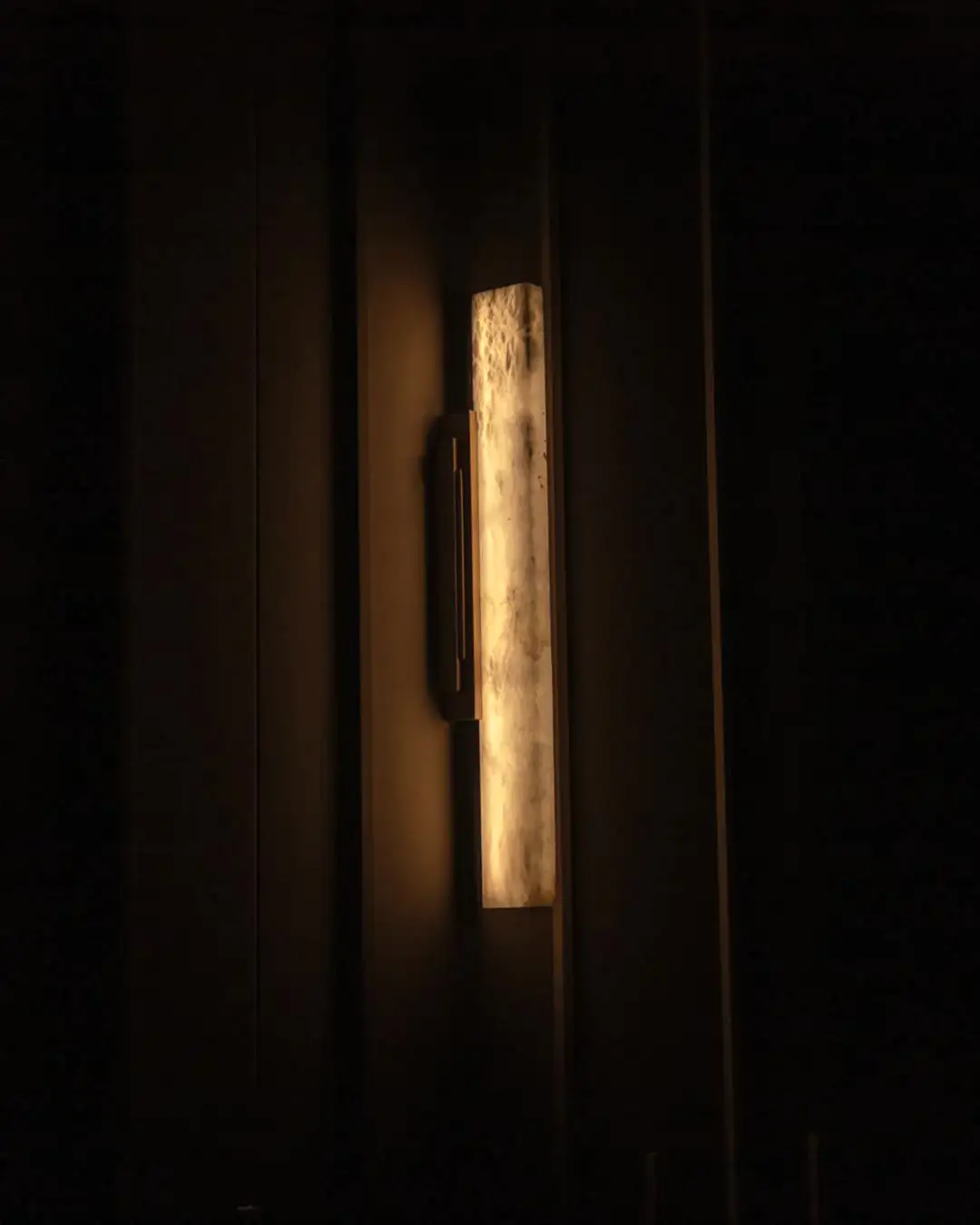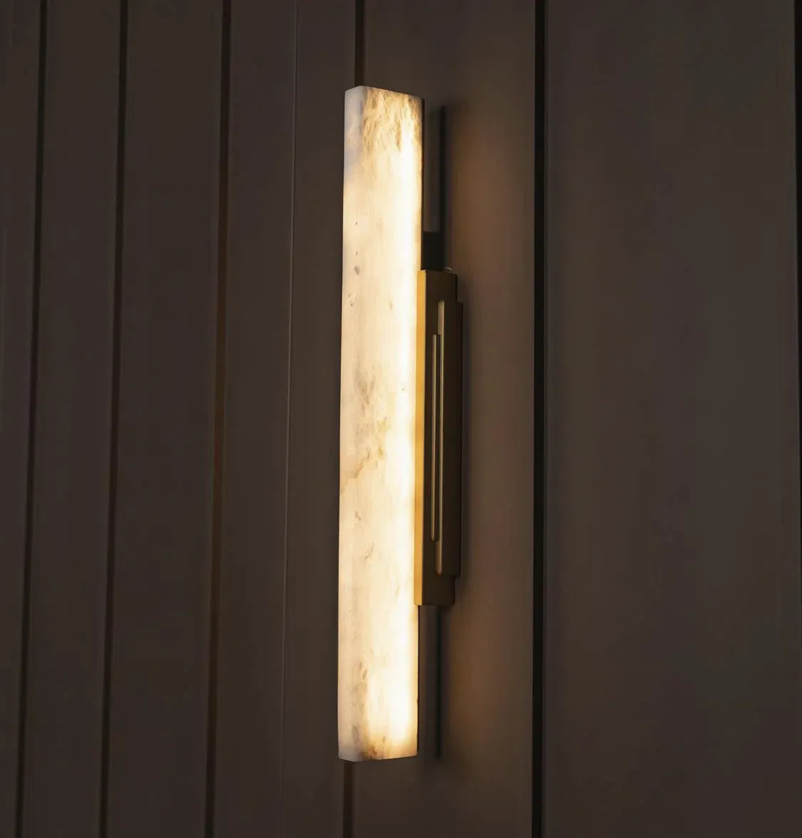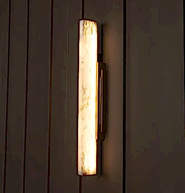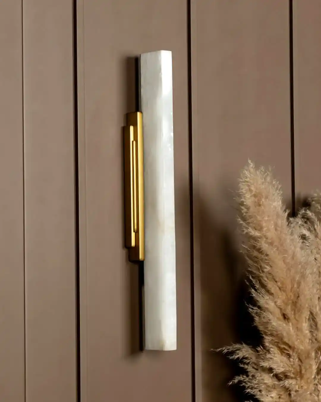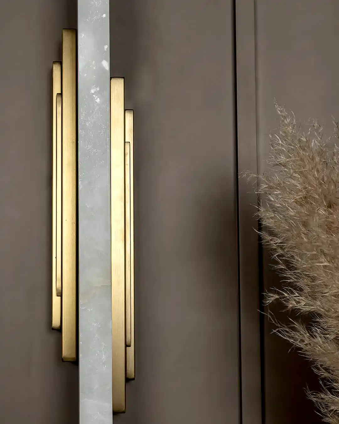 Gabon Mermer Aplik, doğal beyaz mermer yüzeyi ve eskitme tonlarındaki metal detaylarıyla duvarlara zarafet taşır. İnce ve uzun formuyla mekânda dikey bir bütünlük sağlar.