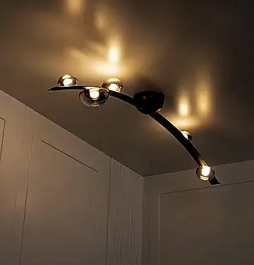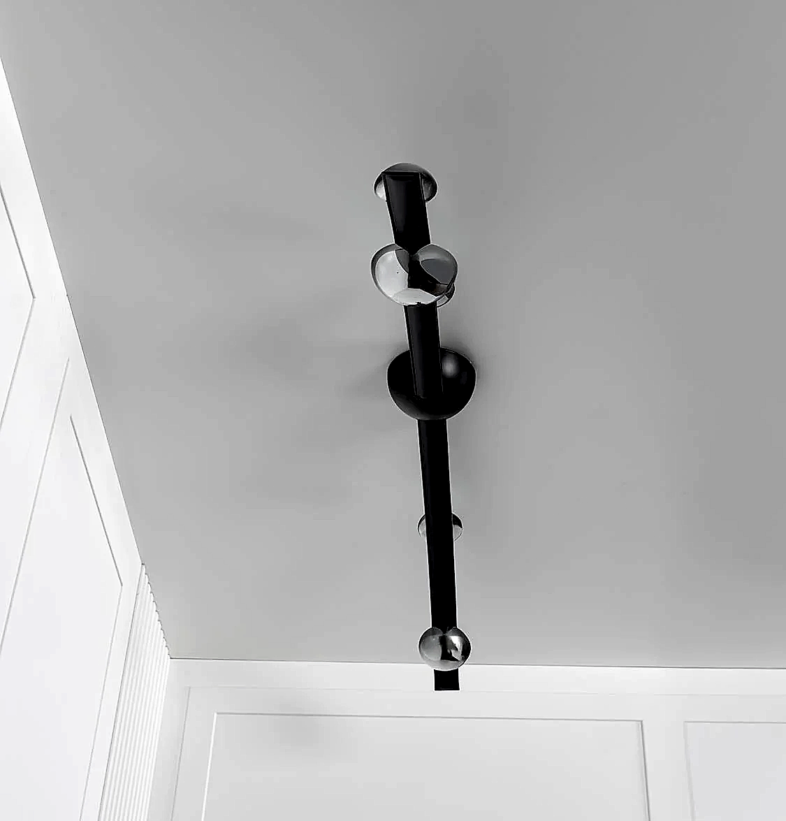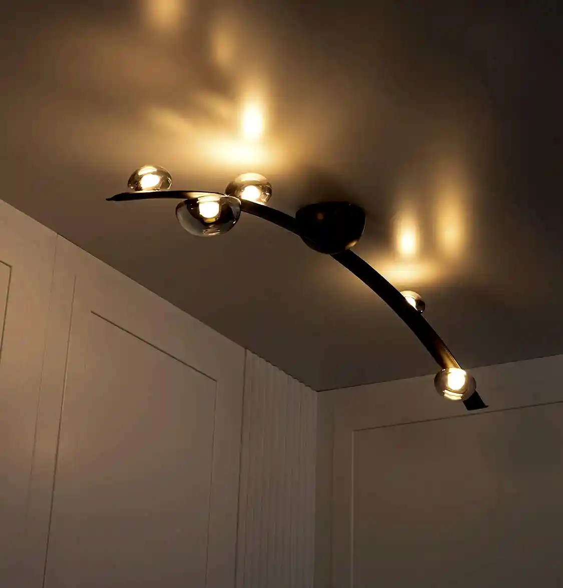 Her biri füme camla kaplı LED aydınlatmalar, ortama yumuşak ve homojen bir ışık yayılımı sağlar. Füme camın yarı geçirgen yüzeyi, ışığı kırarak mekâna sıcak ve derin bir ambiyans katar. Tasarımın koyu tonları modern yaşam alanlarına karakteristik bir hava getirir.