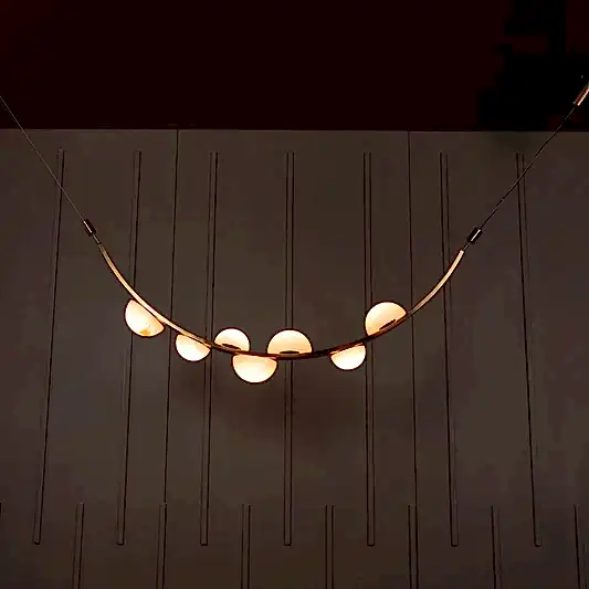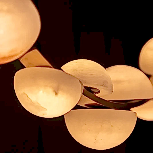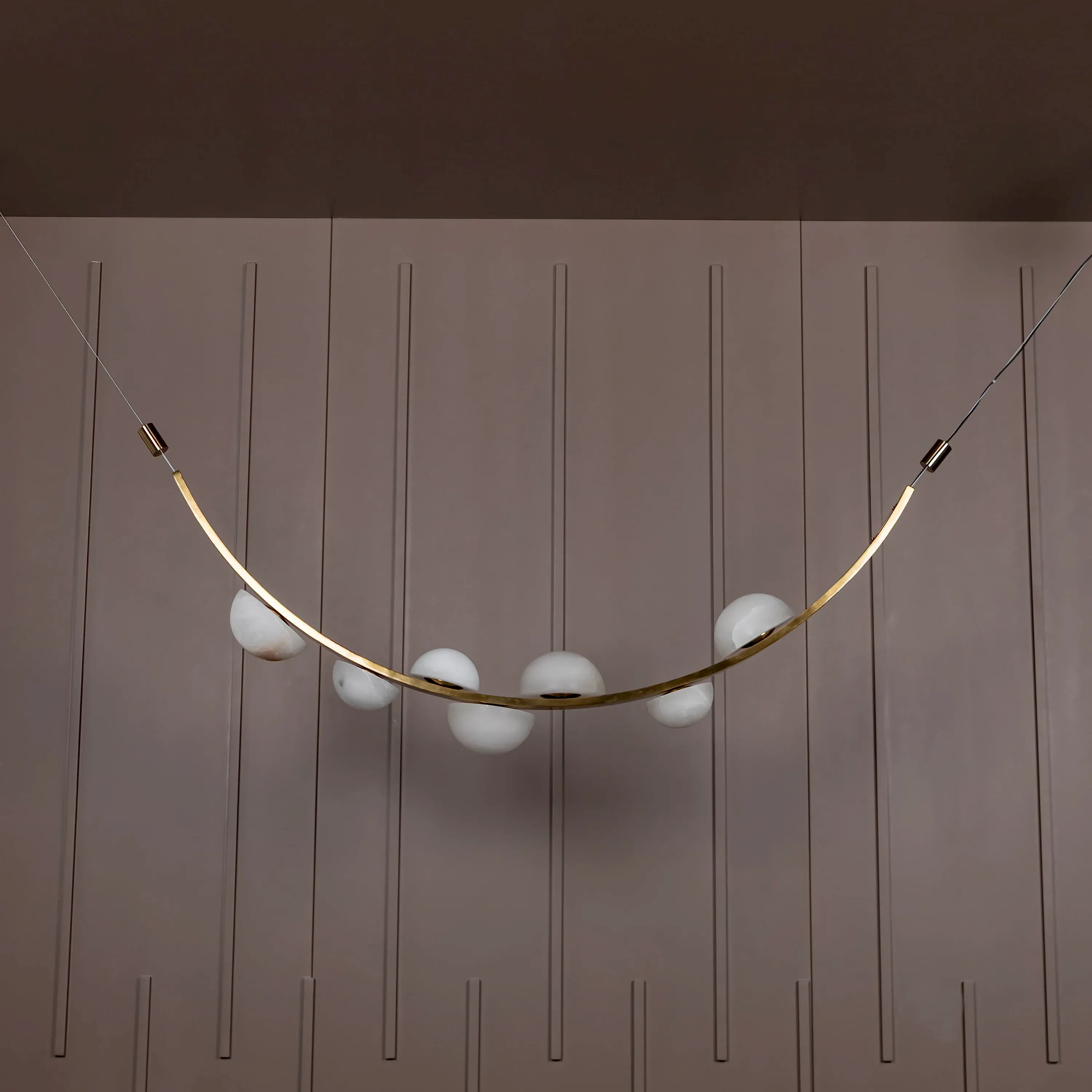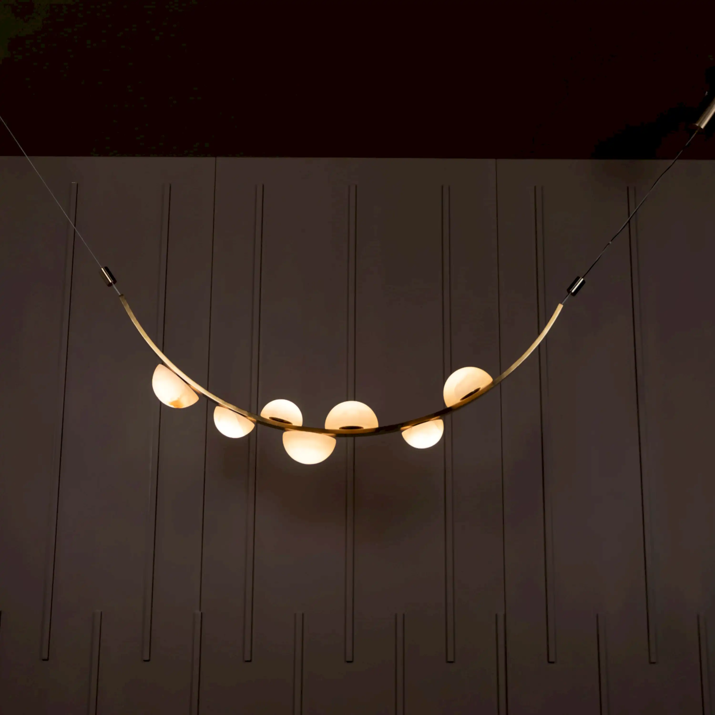 Hartum Avize, geniş formu ve doğal malzeme detaylarıyla yaşam alanlarında sofistike bir etki yaratır. Beyaz mermerin zarif damarları, eskitme metal gövdeyle uyum içinde birleşerek hem sıcak hem rafine bir görünüm sunar. Yatay çizgisiyle özellikle yemek masaları ve büyük salonlar için dengeli bir aydınlatma sağlar.