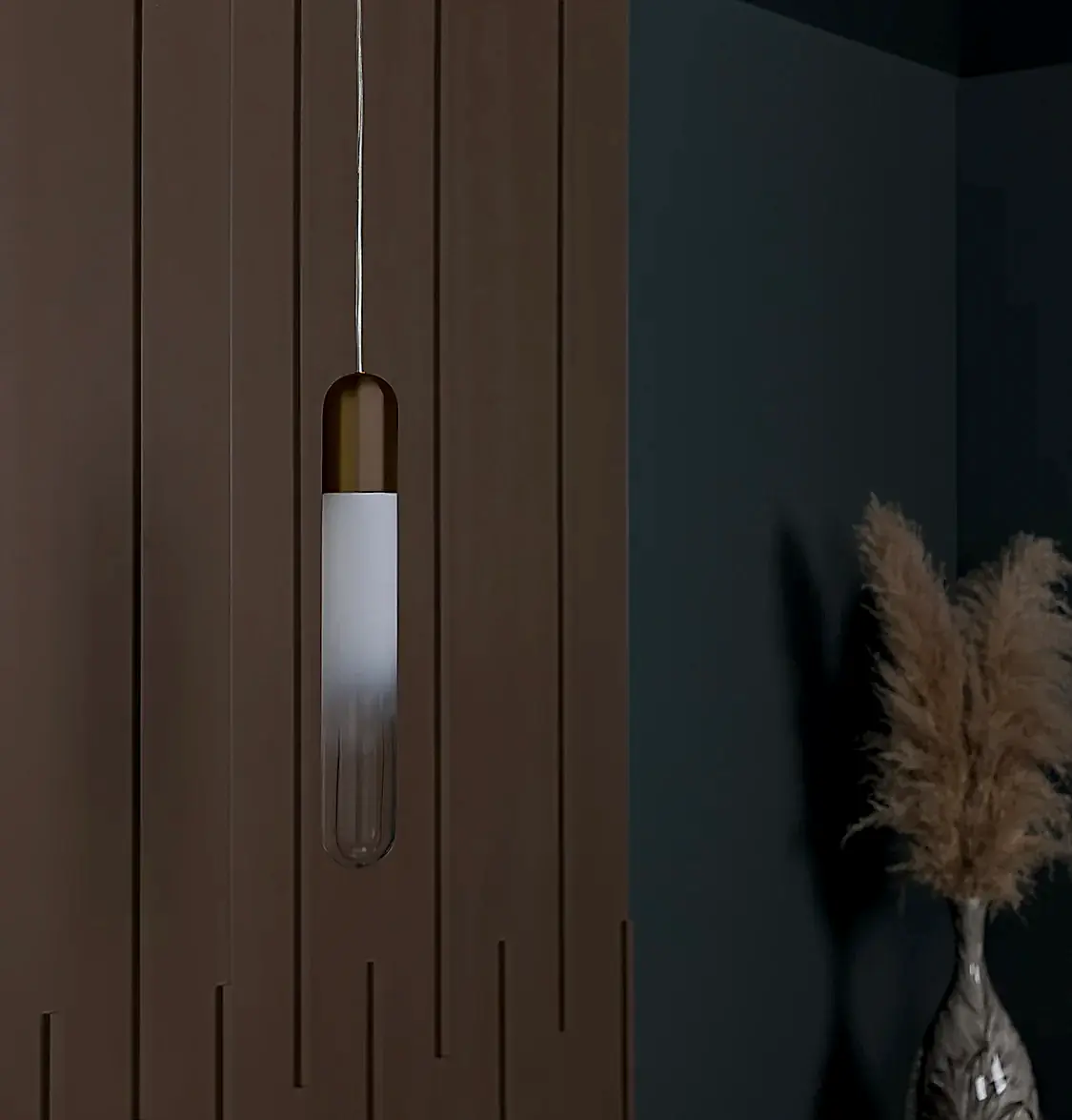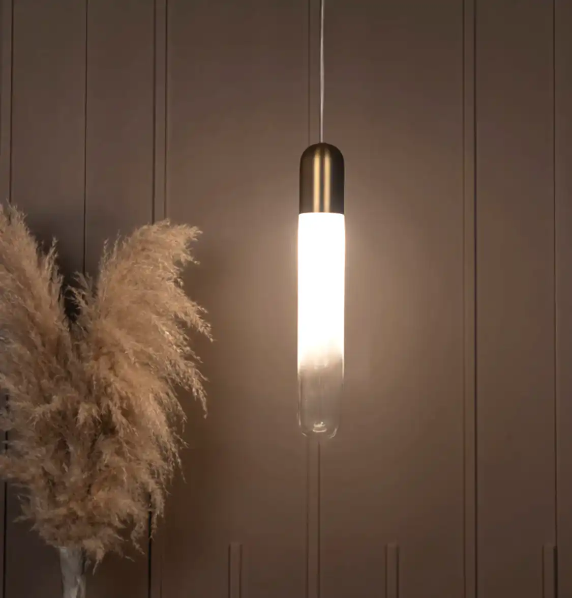 Manila Tekli Sarkıt, altın tonlarındaki metal gövdesi ve şeffaf cam tasarımıyla modern zarafeti mekâna taşır. İnce silueti ve uzun formu, bulunduğu alana hem hafiflik hem de göz alıcı bir detay kazandırır. Altın kaplama yüzey, ışığın yansımalarıyla sıcak bir atmosfer yaratır.