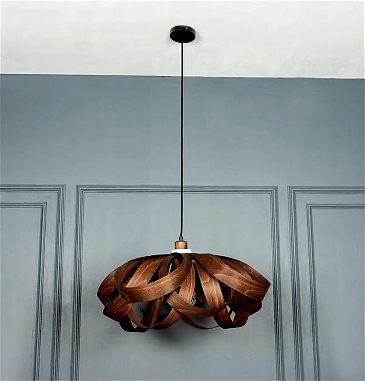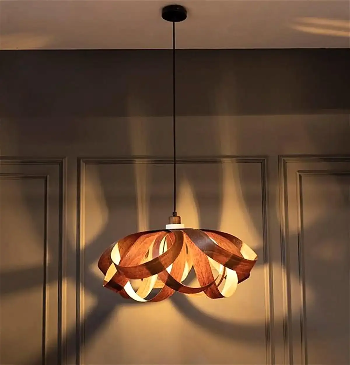 Papirus Sarkıt Avize, wenge tonlarının sıcaklığı ile betonun modern dokusunu bir araya getirir. Ahşap gövdenin doğal görünümü, beyaz beton detaylarla dengelenerek mekâna zamansız bir şıklık kazandırır.