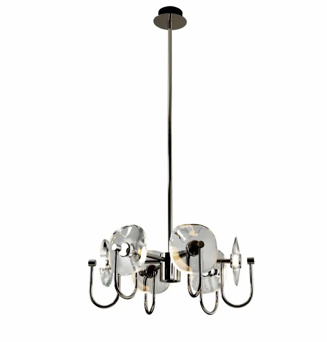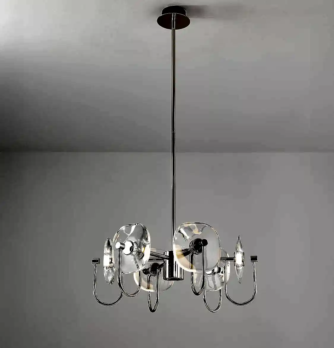 Üsküp Avize, altı kollu yapısı ve kristal etkili şeffaf cam detaylarıyla salonlara klasik ışıltıyı modern bir zarafetle taşır. Krom rengin soğuk parıltısı, ışıkla temas eden cam yüzeylerde büyüleyici bir yansıma oluşturur. Simetrik kurgusu ve şeffaf elemanları sayesinde bulunduğu mekâna ferahlık ve parlaklık kazandırır.