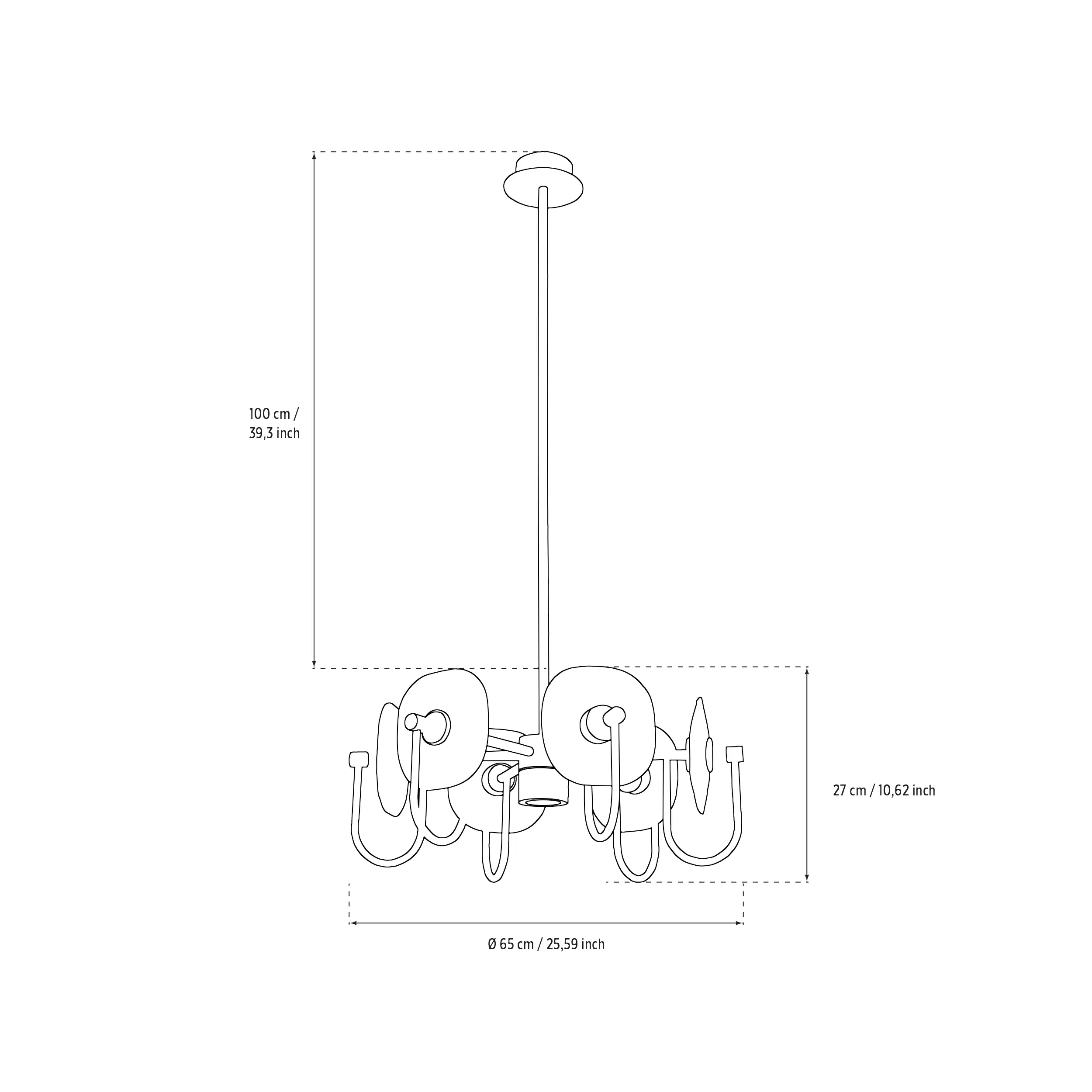 LED aydınlatma sistemi, her bir kol boyunca homojen biçimde ışık yayar ve salon gibi geniş alanlarda dengeli bir atmosfer sağlar. Cam detaylar yalnızca ışığı dağıtmakla kalmaz, aynı zamanda dekoratif bir parıltı efektiyle alanın karakterini güçlendirir. Üsküp, zamansız çizgilere sahip şık ve dengeli bir tasarımdır.