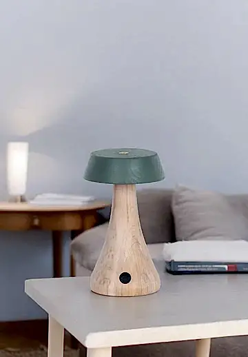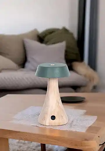Morchella Şarjlı Yeşil Masa Lambası, doğal ahşap gövdesi ve sakin yeşil başlığıyla sıcak, yalın ve modern bir görünüm sunar. Yumuşak LED ışığıyla bulunduğu ortama loş ve huzurlu bir atmosfer katar.
