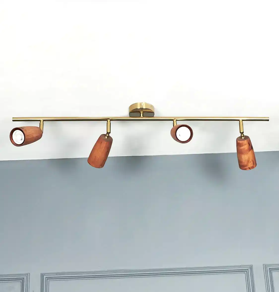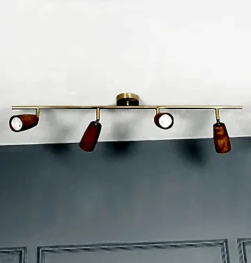 Angel Aplik, jatoba ahşap ve eskitme metalin sıcak uyumunu taşır. Dörtlü formu, geniş yüzeylerde güçlü bir ışık yayılımı sağlar.