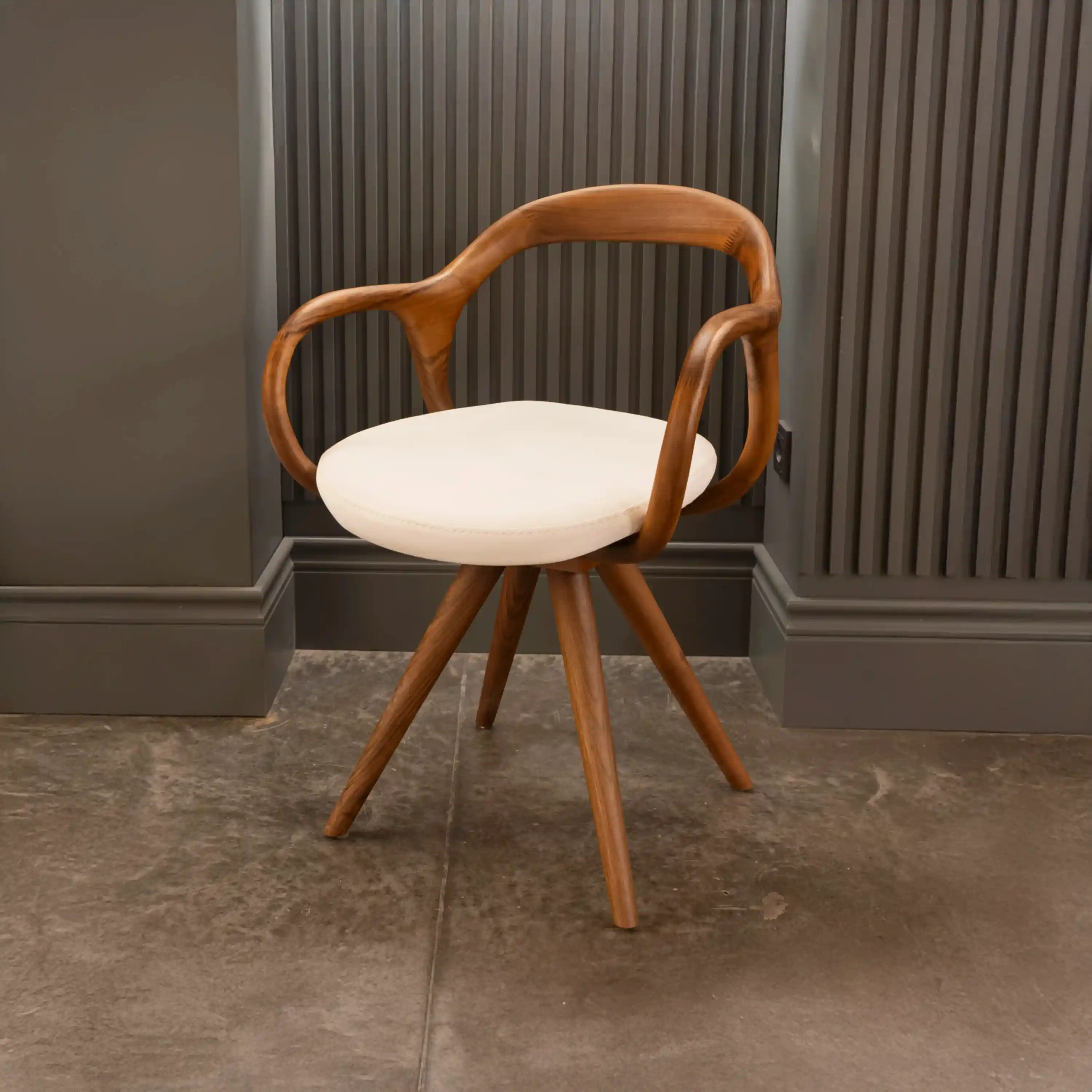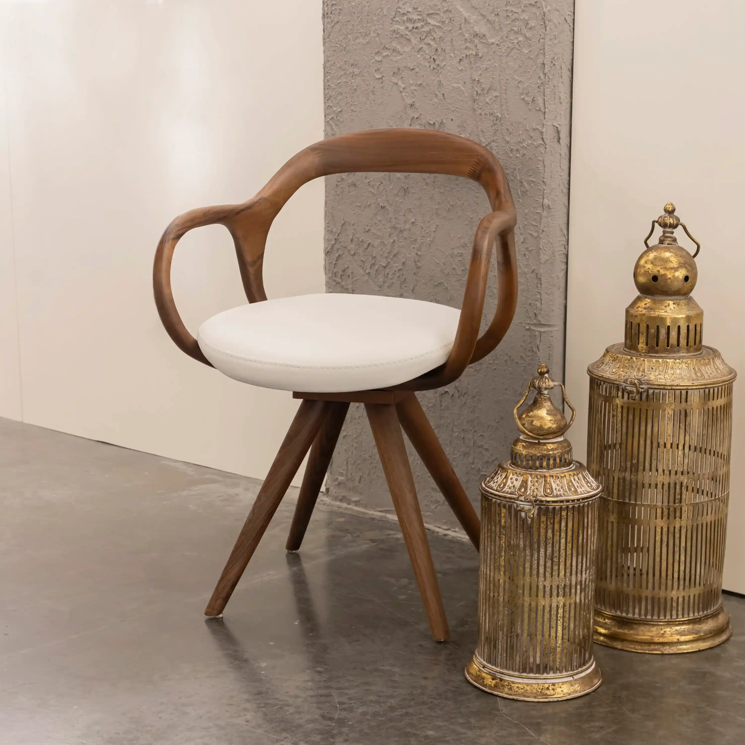 Nox Ceviz Sandalye, ceviz ahşabın sıcak dokusunu modern tasarım çizgileriyle bir araya getiriyor. Bej kumaş döşemesiyle yumuşak ve konforlu bir oturum sunarken, döner mekanizması kullanım kolaylığı sağlar.