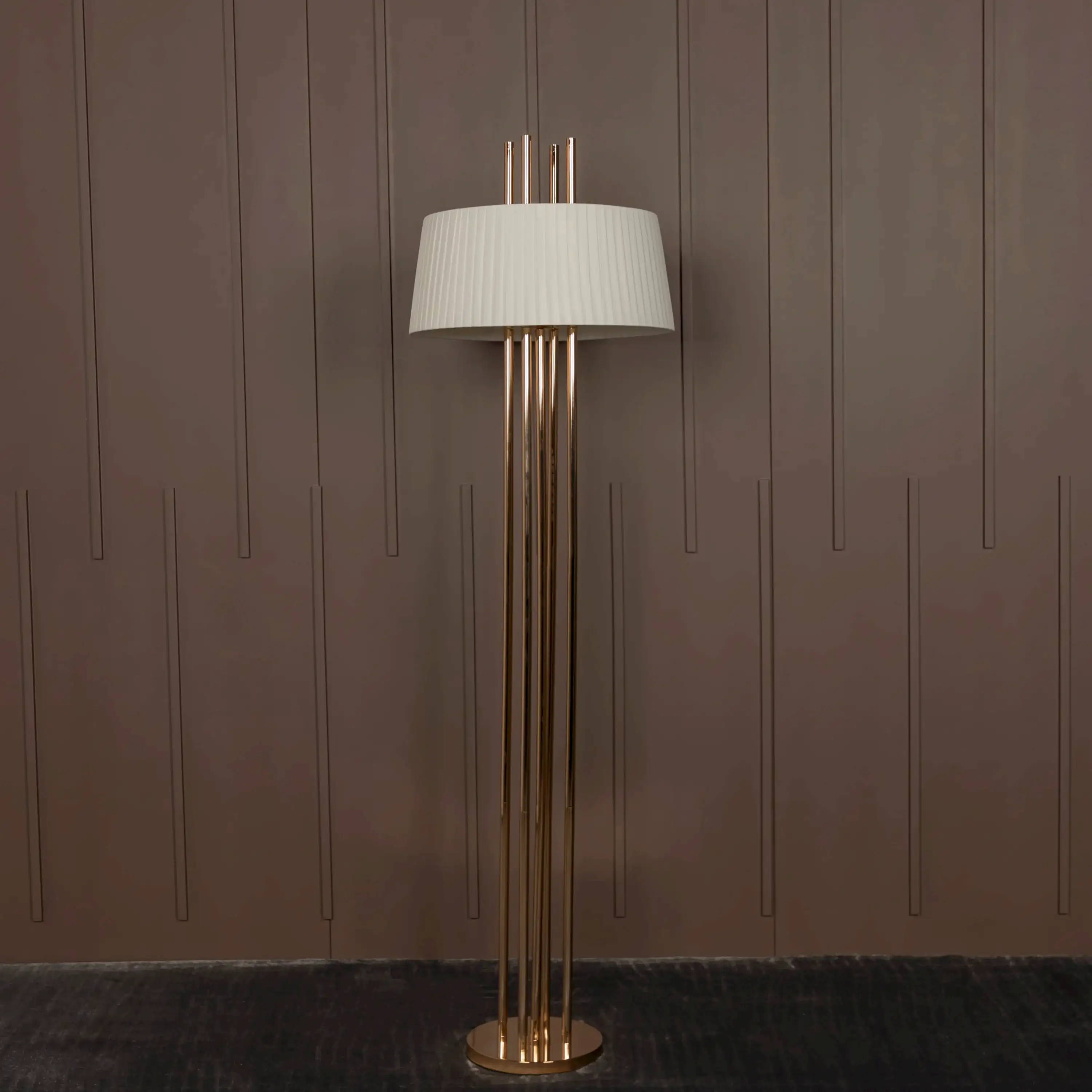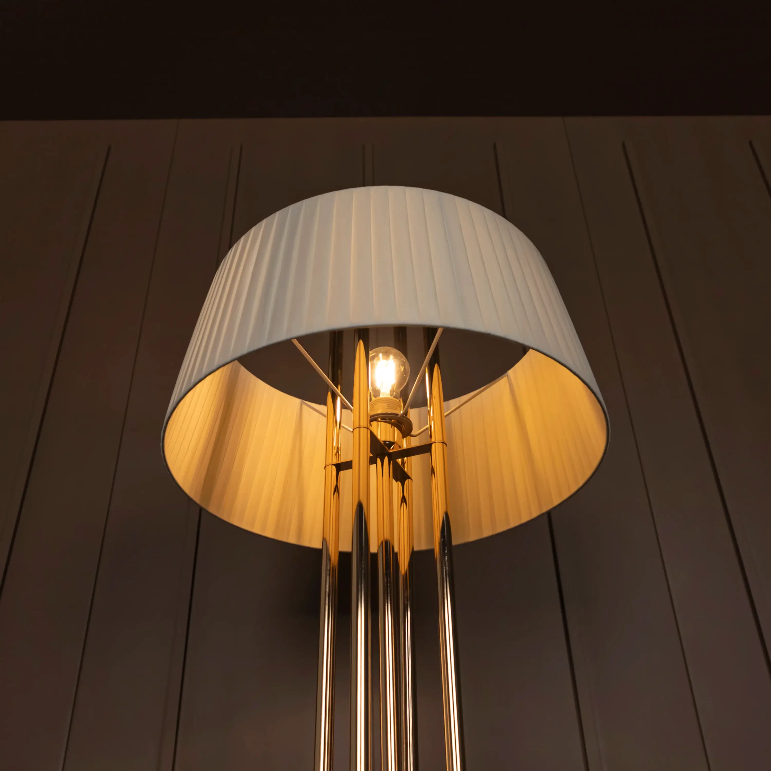 Napoli Lambader, gold metalin lüks ışıltısını krem kumaşın yumuşak dokusuyla bir araya getiriyor. Geniş formu ve zarif siluetiyle modern iç mekanlarda çarpıcı bir vurgu oluşturuyor.