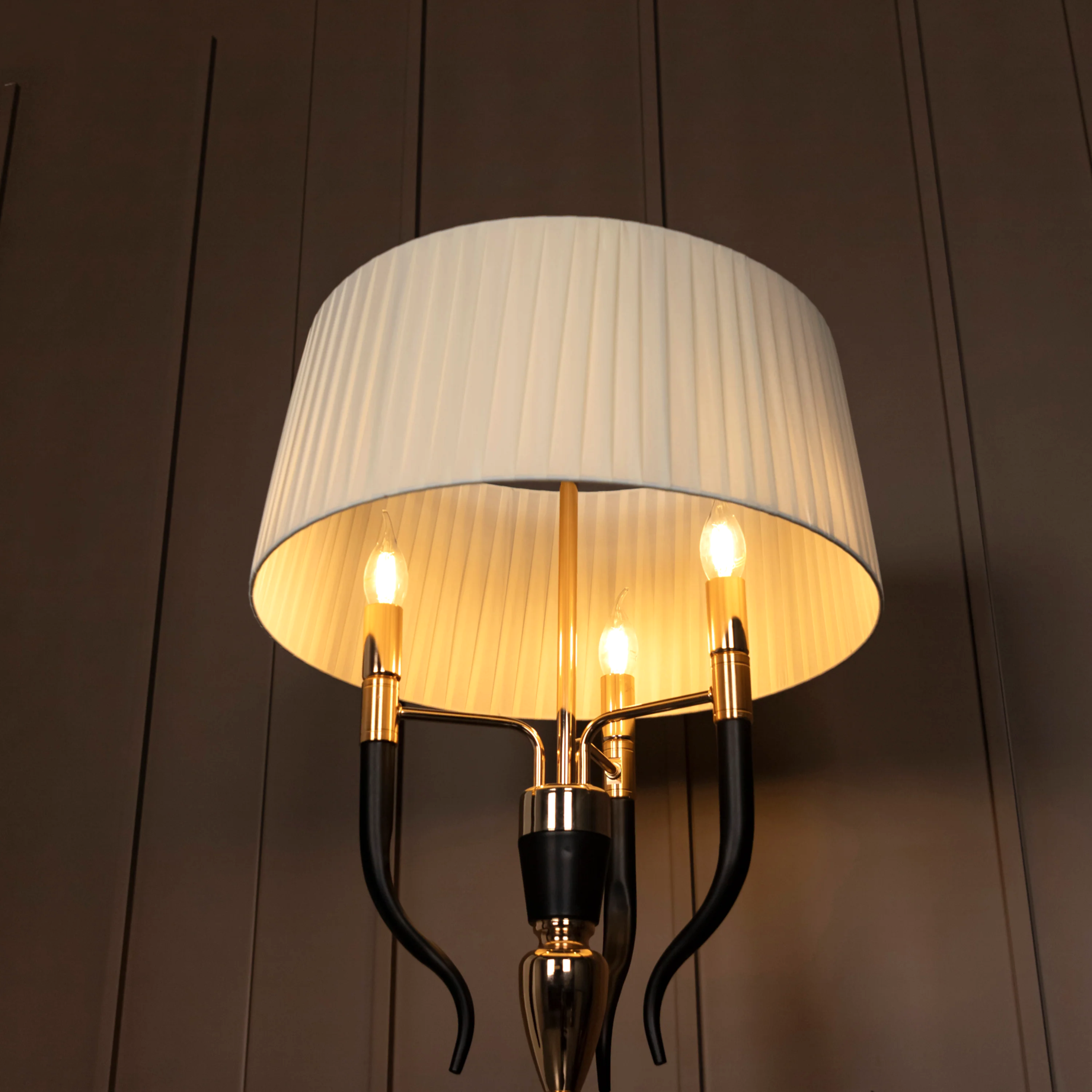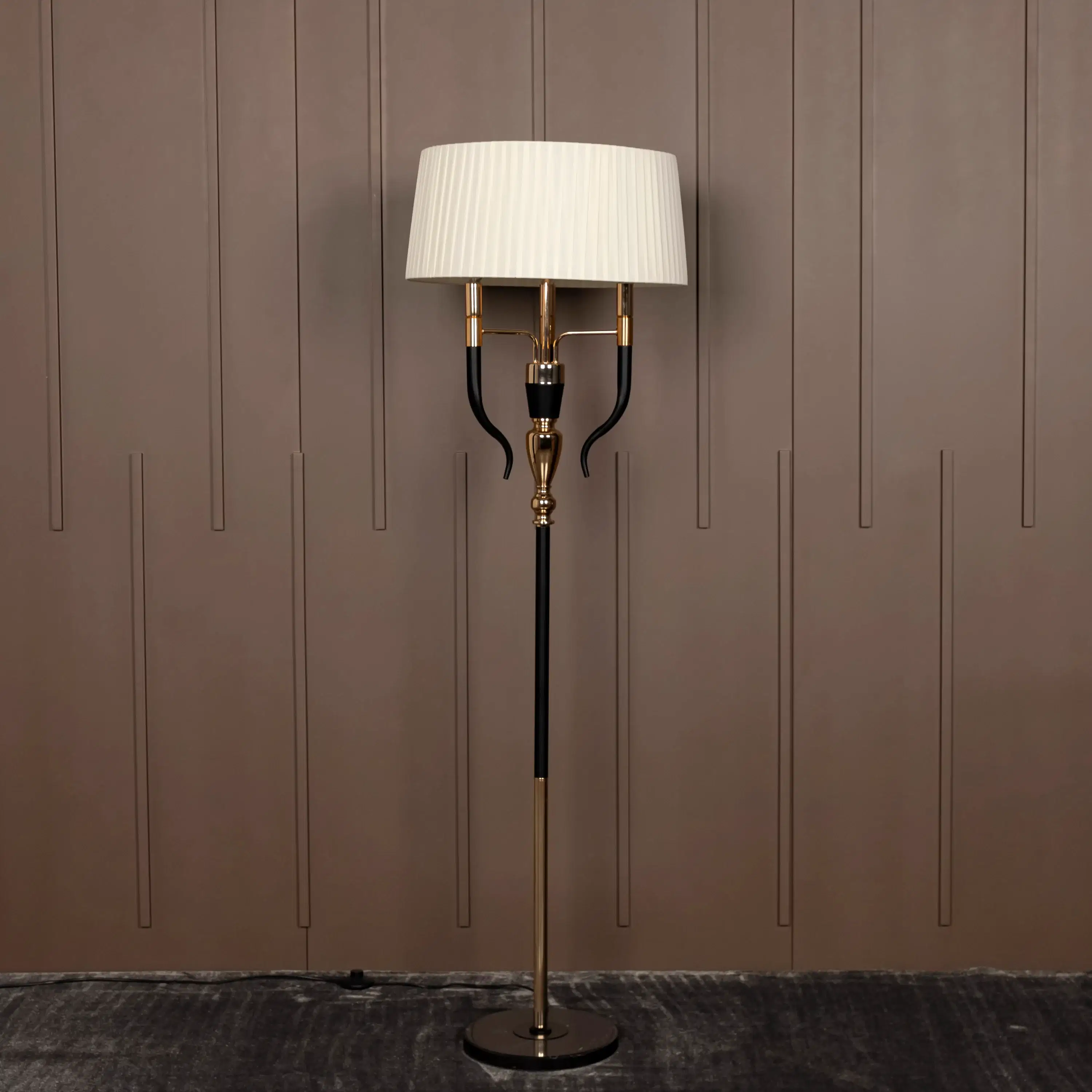 Torino Lambader, gold metalin ihtişamını siyah detayların modern şıklığıyla harmanlayarak dikkat çeken bir tasarım sunuyor. Üç kollu yapısı ve zarif siluetiyle mekâna mimari bir dinamizm kazandırır.