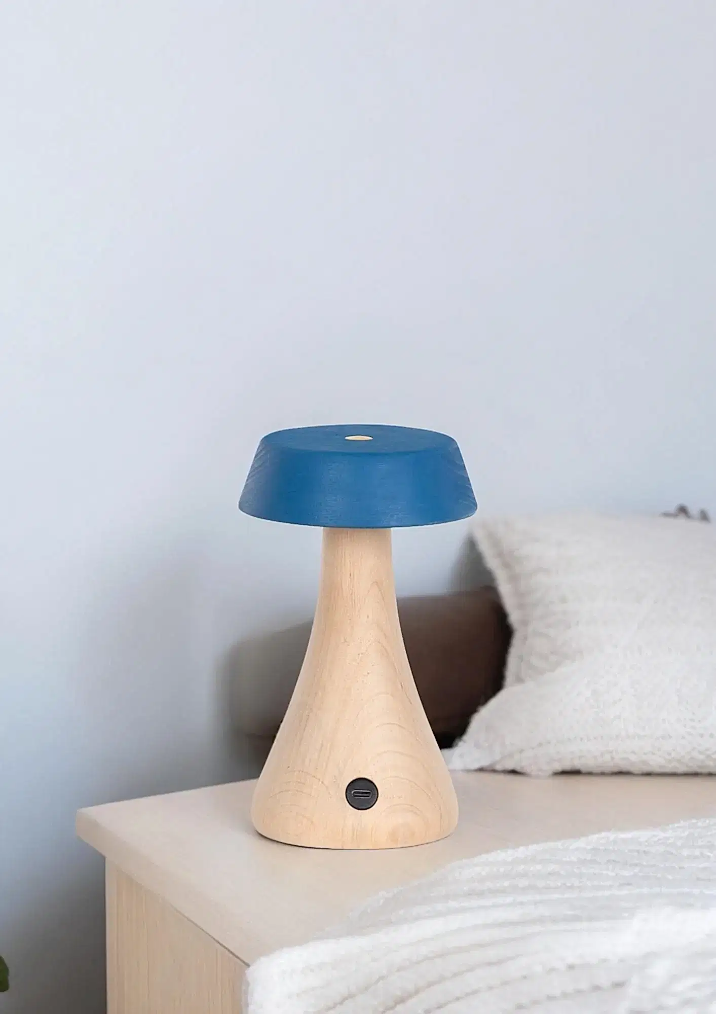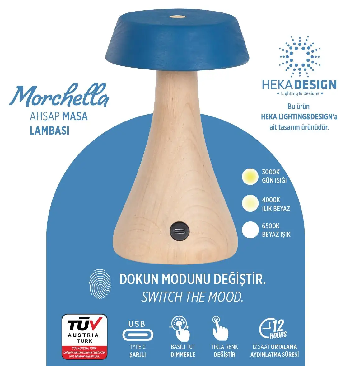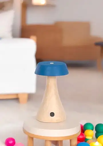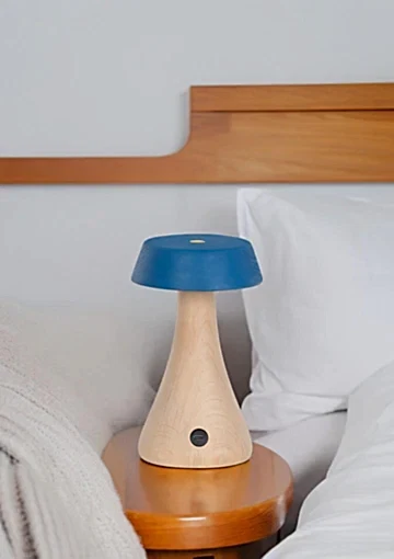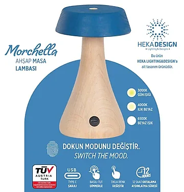 Morchella Şarjlı Mavi Masa Lambası, doğal ahşap gövdesi ve sakin mavi başlığıyla sıcak, yalın ve modern bir görünüm sunar. Yumuşak LED ışığıyla bulunduğu ortama loş ve huzurlu bir atmosfer katar.