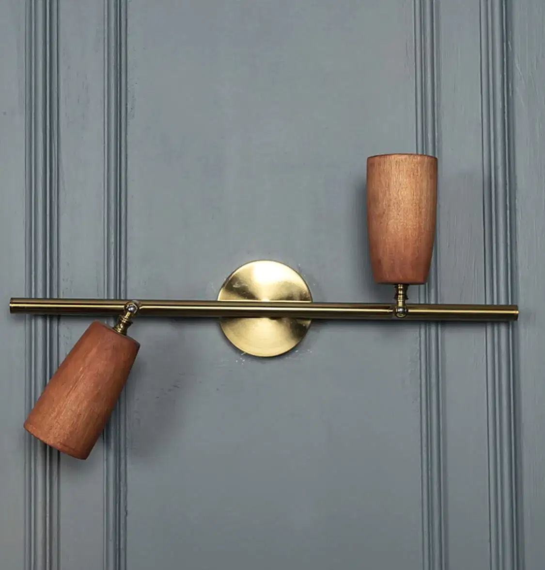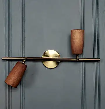 Angel Aplik, jatoba ahşap gövde ve eskitme metal detaylarıyla sıcak bir görünüm sunar. İkili formu, kompakt alanlarda dengeli aydınlatma sağlar.