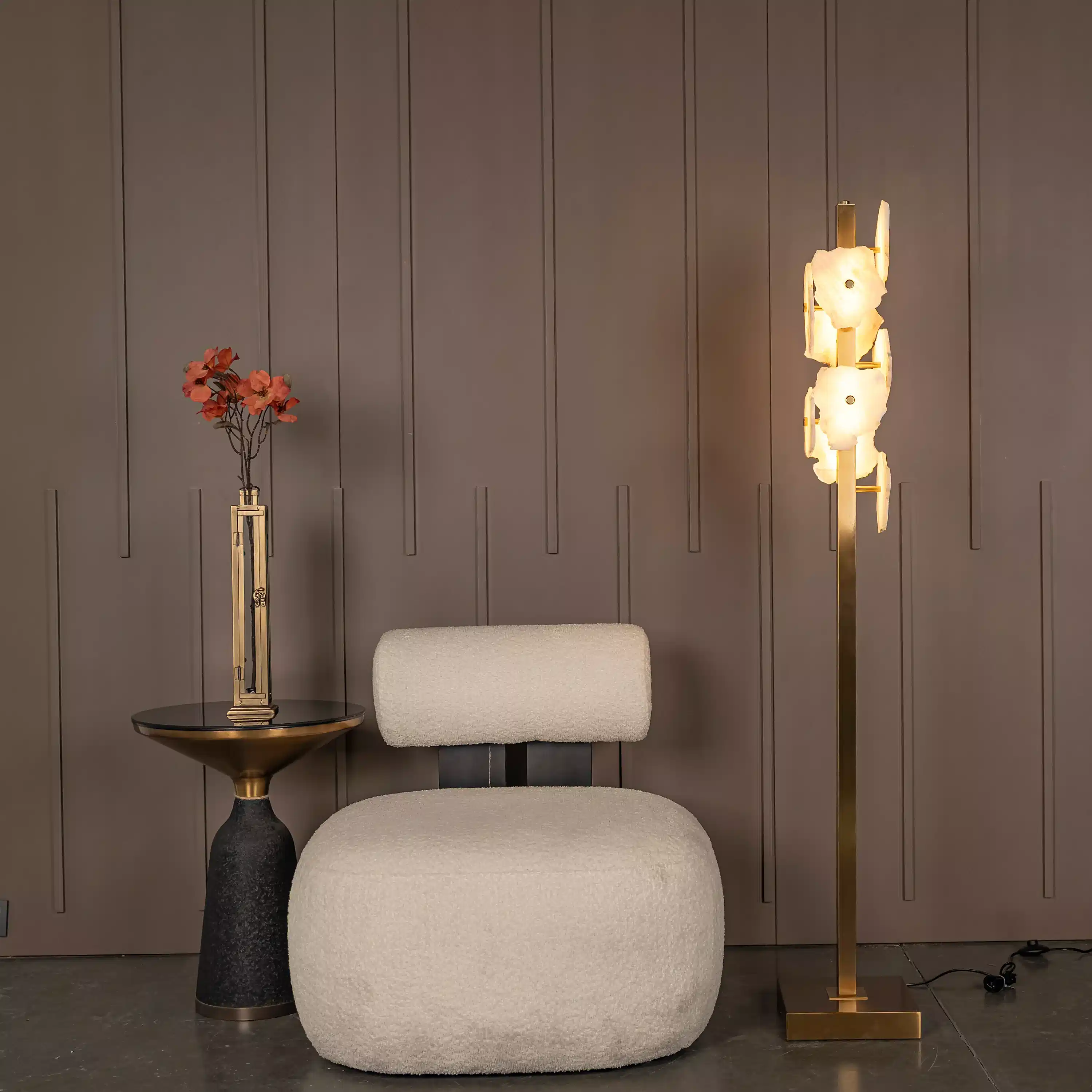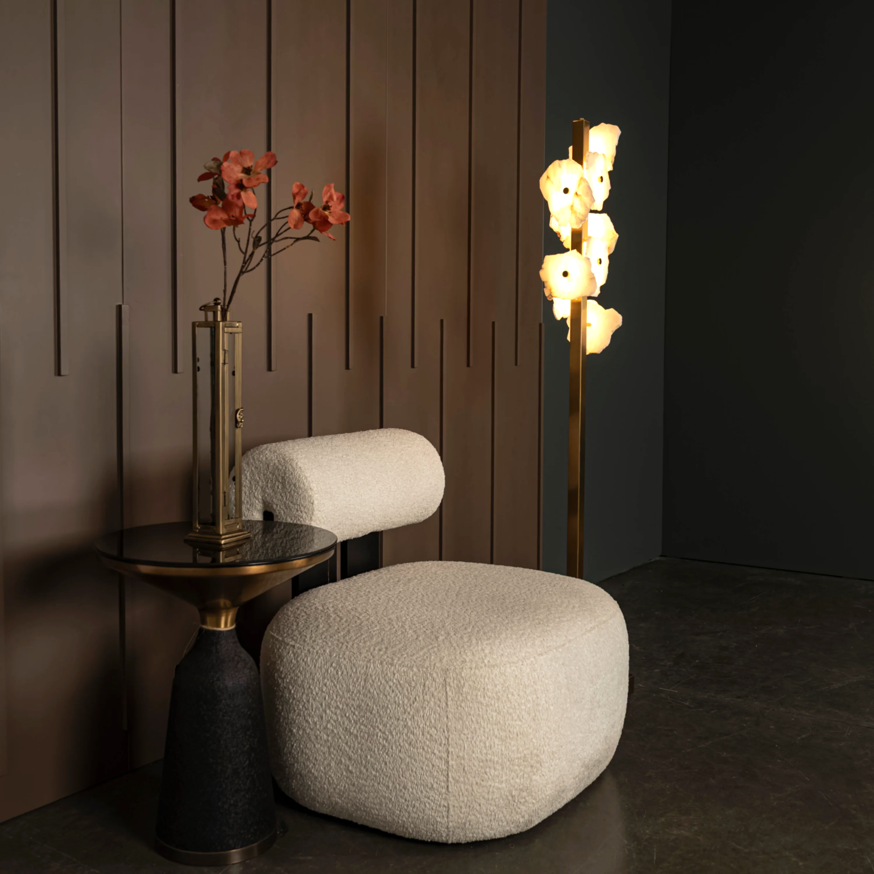 Anvers Mermer Lambader, beyaz mermer detaylarıyla mekânlara doğallık kazandırırken, eskitme renkli metal gövdeyle lüks ve modern tasarımı bir araya getirir. Organik formlu beşli mermer çiçek dizilimiyle özgün ve artistik çizgilere sahip olan Anvers, oturma odası ve yatak odası gibi alanlarda göz alıcı bir tasarım öğesi olur.