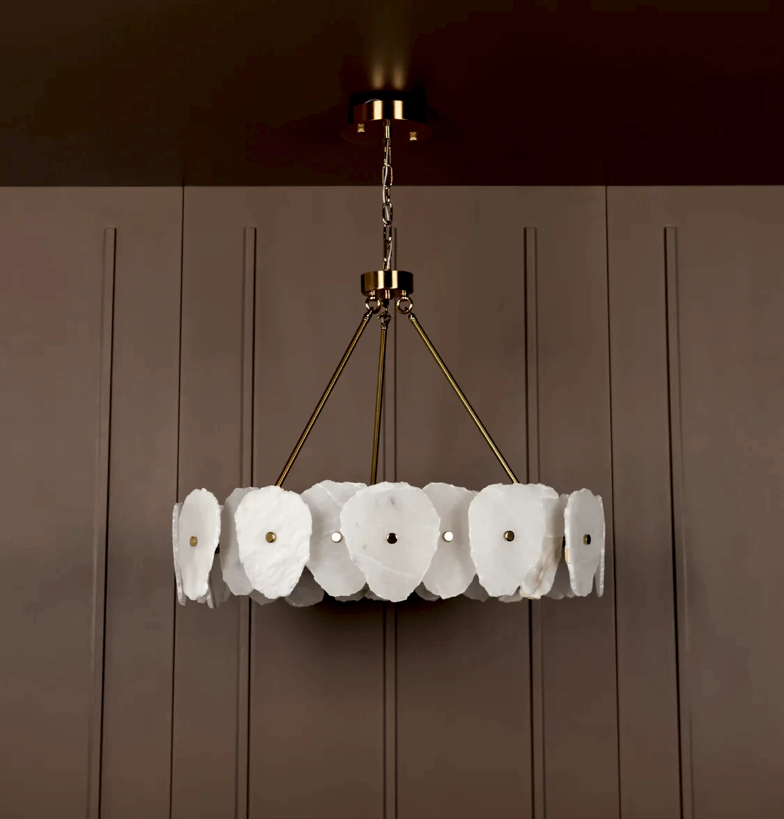 Anvers Salon Avize, eskitme metal dokusu ve beyaz mermer detaylarıyla zamansız bir şıklık yaratır. Heykelsi formları ve güçlü gövdesi, geniş salonlarda bile tek başına mekâna karakter kazandırır.