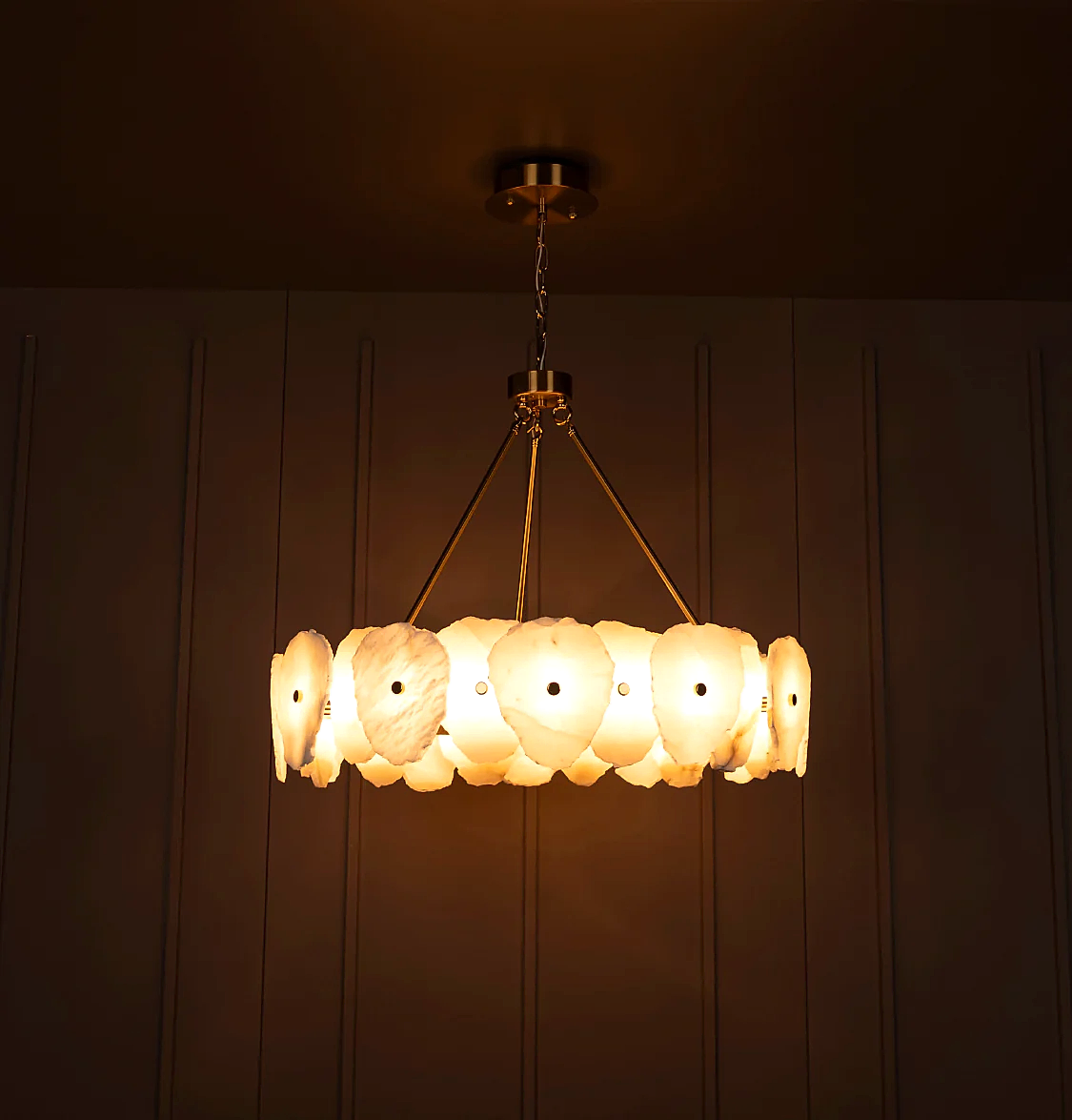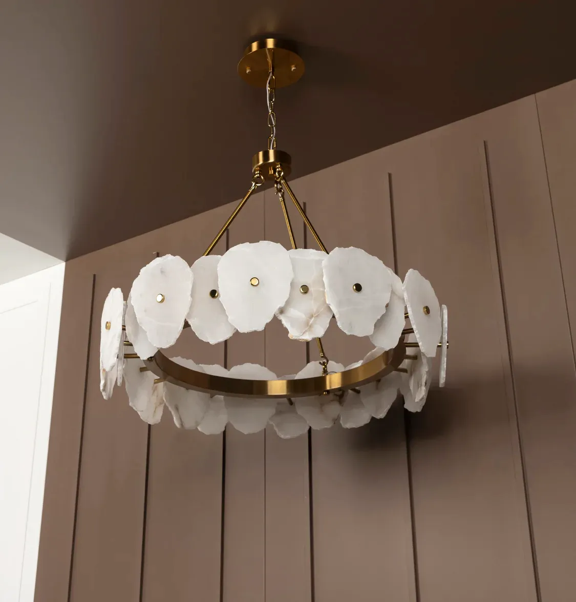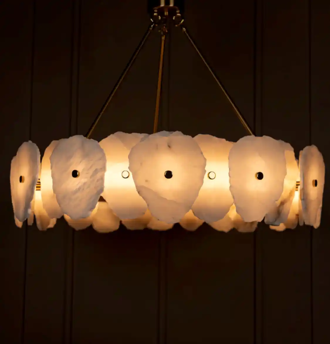 Mermerin doğal damarları ve metalin eskitme dokusu, LED ışığın yumuşak aydınlığıyla birleşerek hem modern hem klasik dekorasyonlara uyum sağlar. Avizenin geniş ölçüleri, özellikle yüksek tavanlı salonlarda göz alıcı bir odak noktası oluşturur.