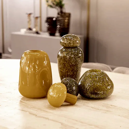 Şekerliğin kapak bölümü, ana formu tamamlayan uyumlu bir siluet sunarak ürünün heykelsi bütünlüğünü güçlendirir. Kompakt boyutu sayesinde hem işlevsel hem de dekoratif bir obje olarak kullanılabilir. Sehpa üzerinde tek başına sergilendiğinde etkileyici bir vurgu objesi olurken; diğer cam aksesuarlarla birlikte kullanıldığında mekânın renk ve doku zenginliğini artırır.