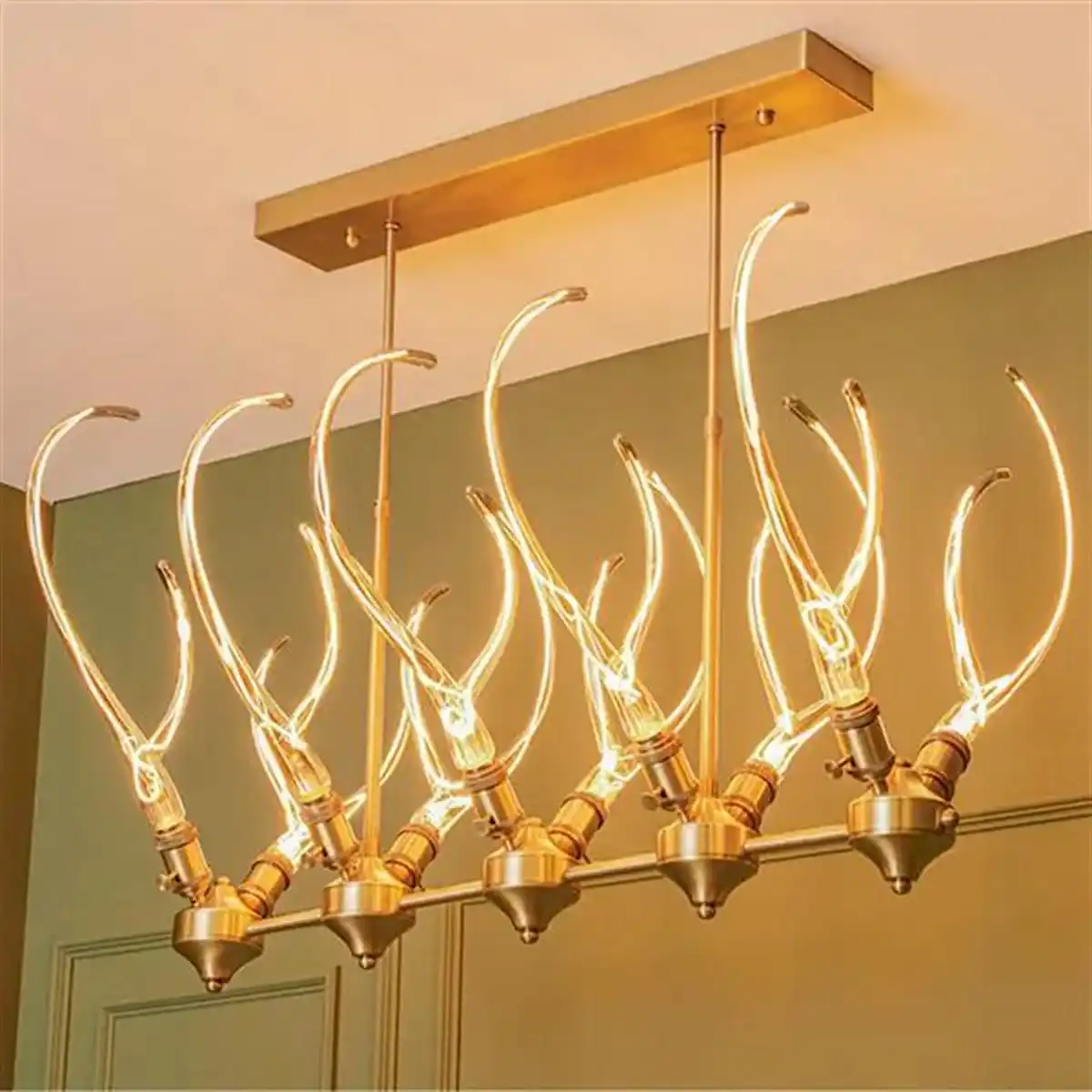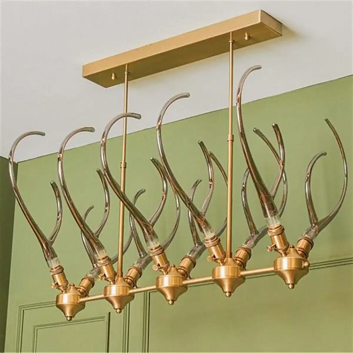 Galata Avize, eskitme tonlardaki metal gövdesini füme cam detaylarla birleştirerek zamansız bir şıklık sunar. On ampullük geniş yapısı, büyük yemek masalarının üzerinde ışığı dengeli ve çarpıcı bir biçimde yayar.