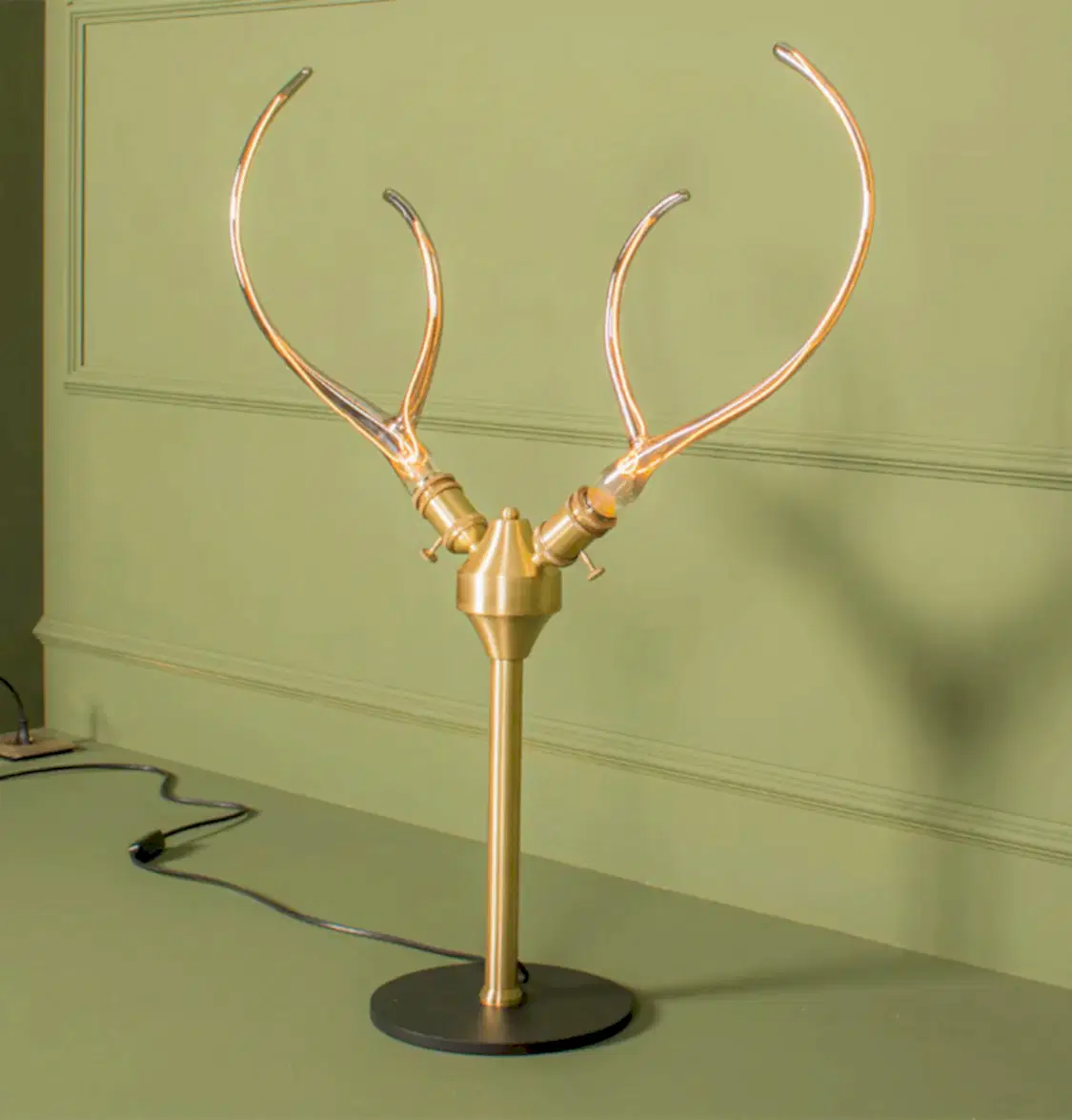 Galata 2’li Masa Lambası, geyik boynuzunu andıran kıvrımlı gövdesiyle rustik ve avangart tasarımı bir arada sunar. Eskitme yüzeyi ve füme camlarıyla sofistike bir atmosfer yaratır.