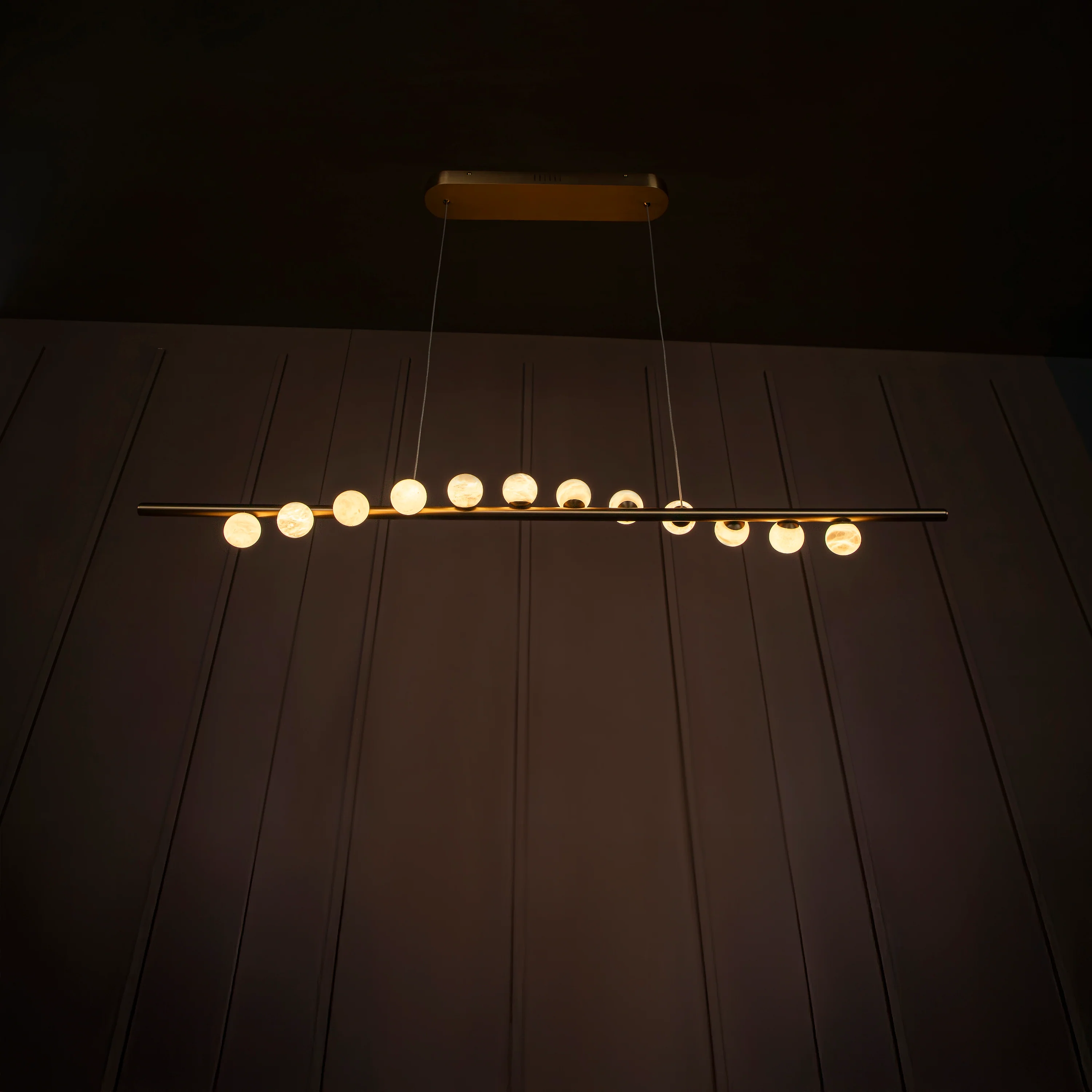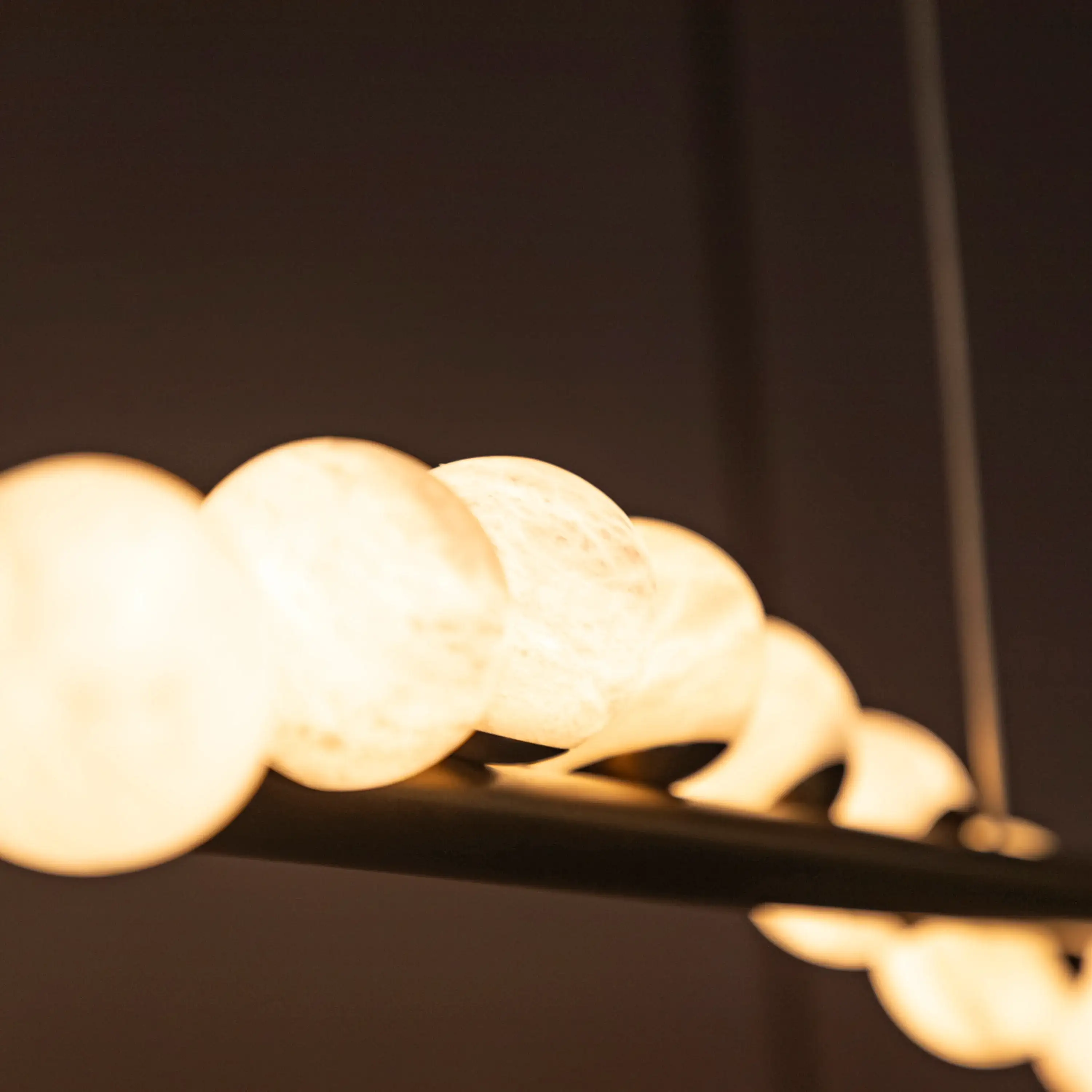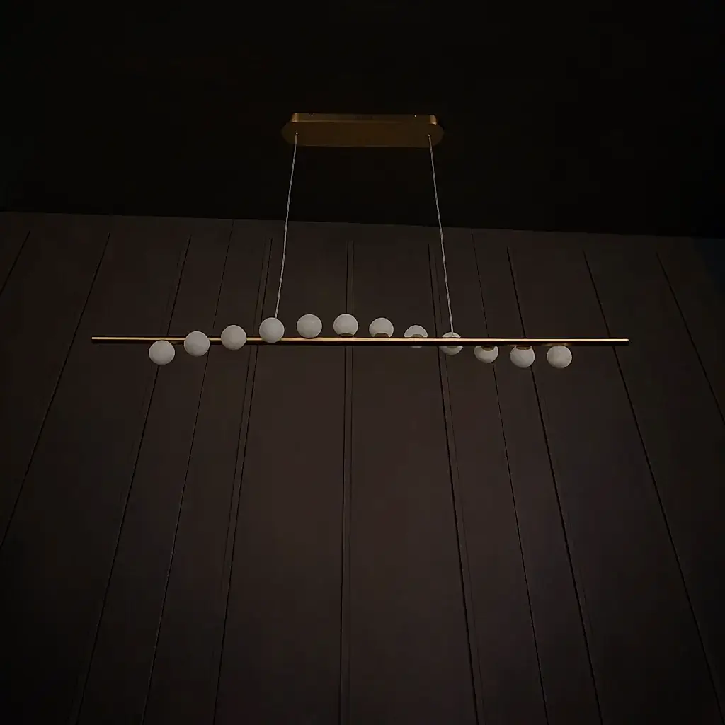 Gine Avize, doğal beyaz mermer kürelerin asaleti ve eskitme metalin sıcaklığı ile yemek alanlarına sanatsal bir zarafet katıyor. Her bir mermer küre, kendi damar yapısı sayesinde ürüne eşsiz bir karakter kazandırıyor. Eskitme detaylar ise tasarıma vintage bir hava katıyor.