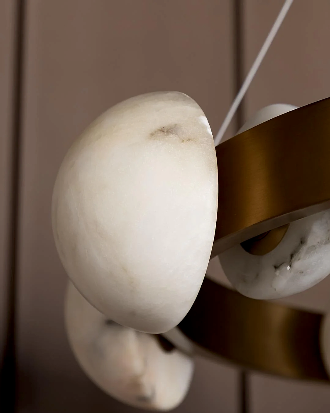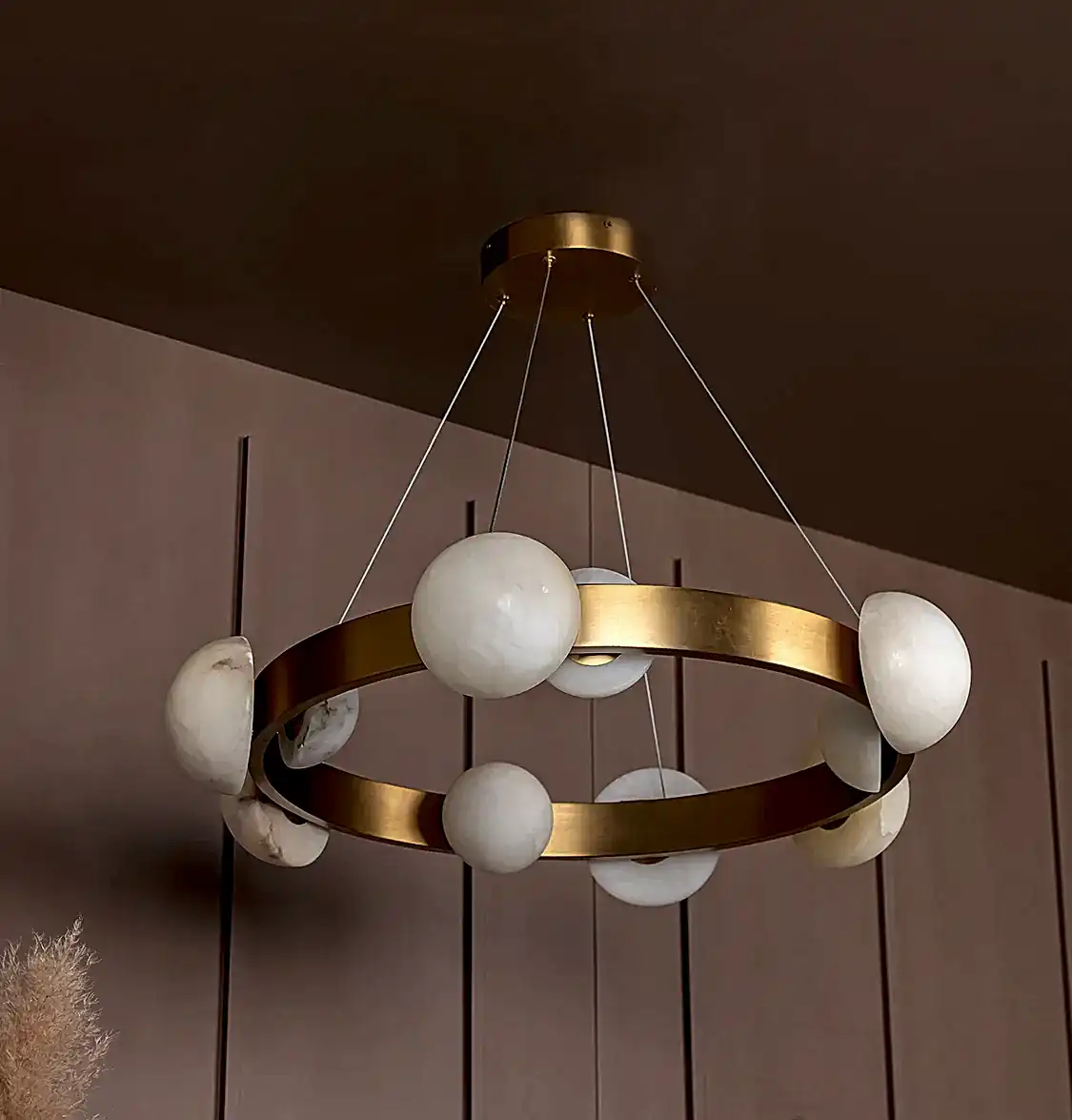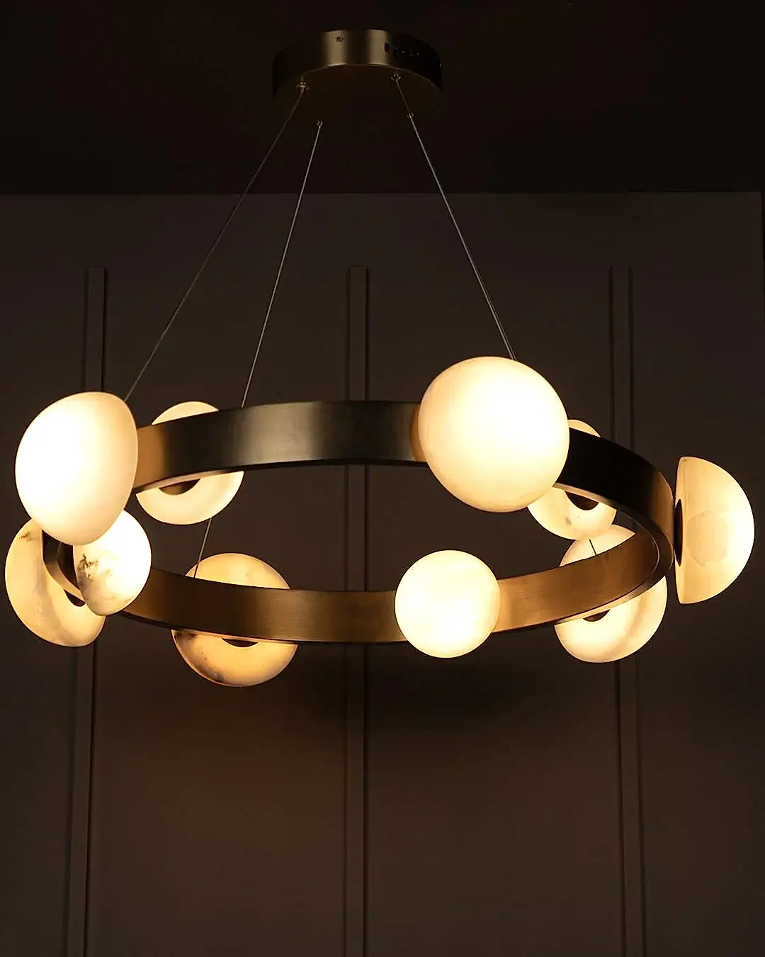 Hartum Avize, eskitme metal gövdesiyle birleşen doğal beyaz mermer detayları sayesinde zamansız ve sofistike bir tasarım sunar. Mermerin özgün damarları, her bir ürüne tekil bir karakter kazandırırken; yatay yerleşimiyle geniş salonlarda dengeli bir aydınlık sağlar. Modern çizgilerle klasik dokuları ustalıkla buluşturan bir formdadır.