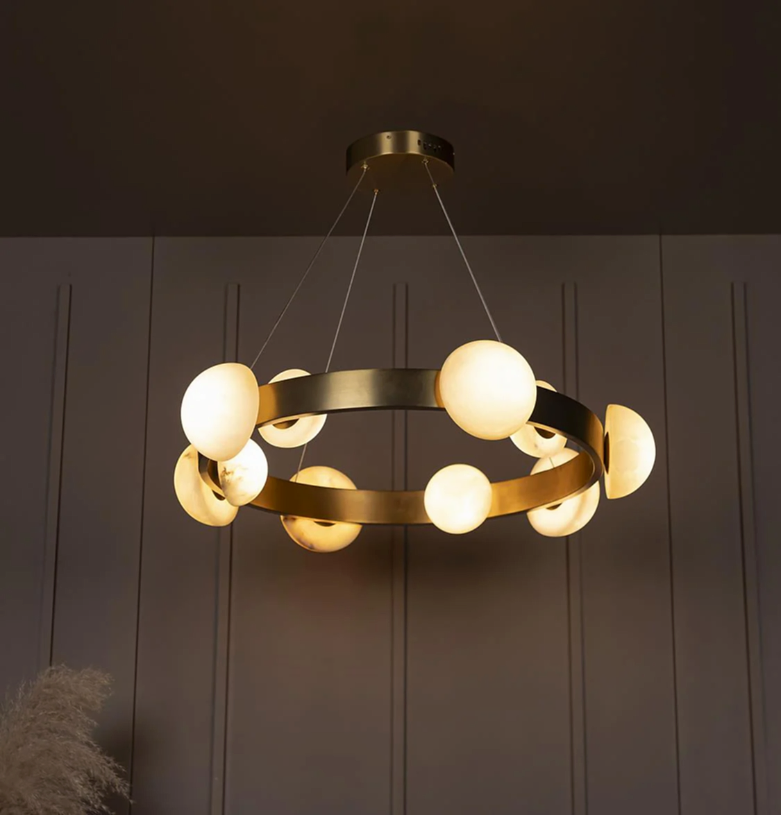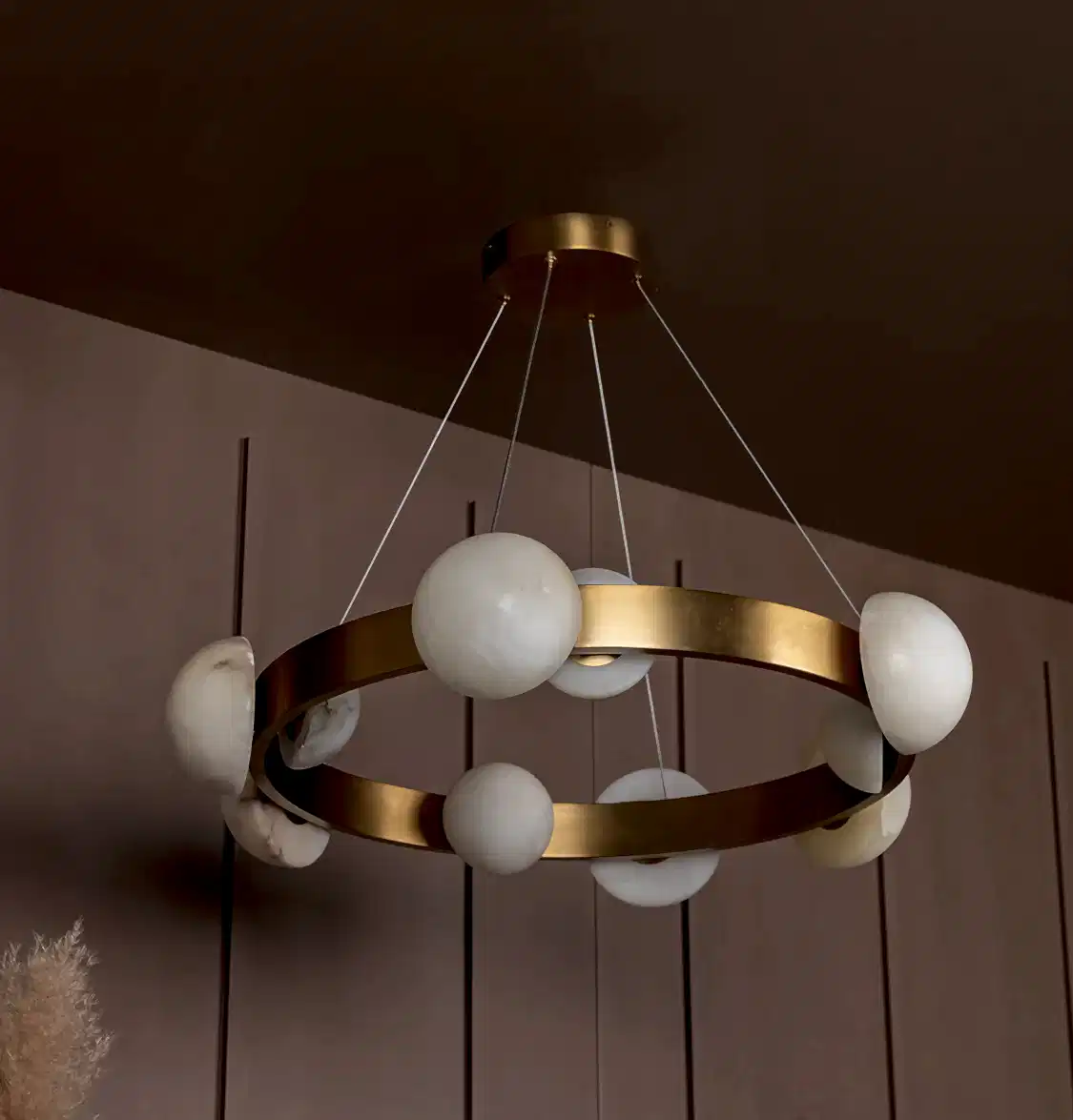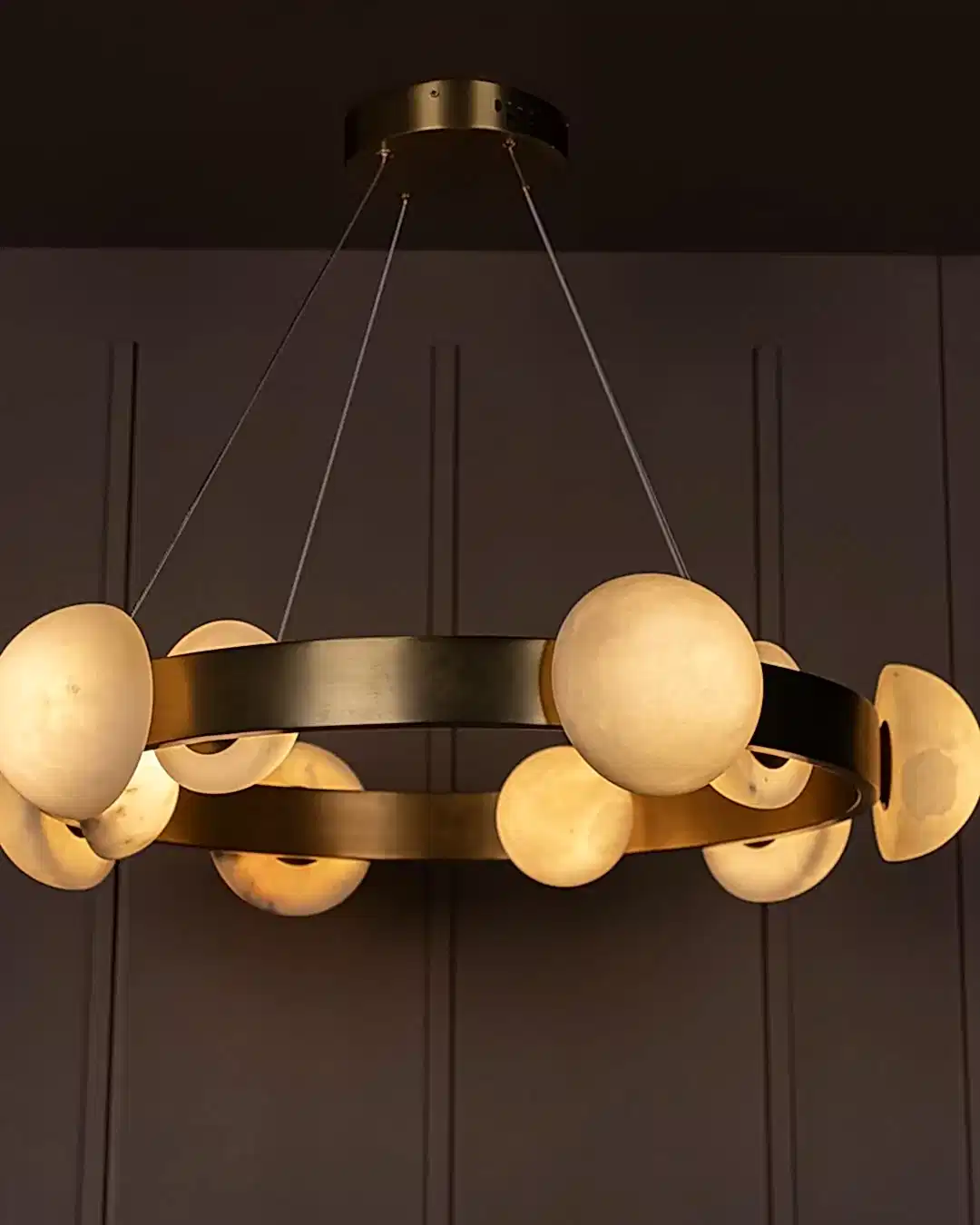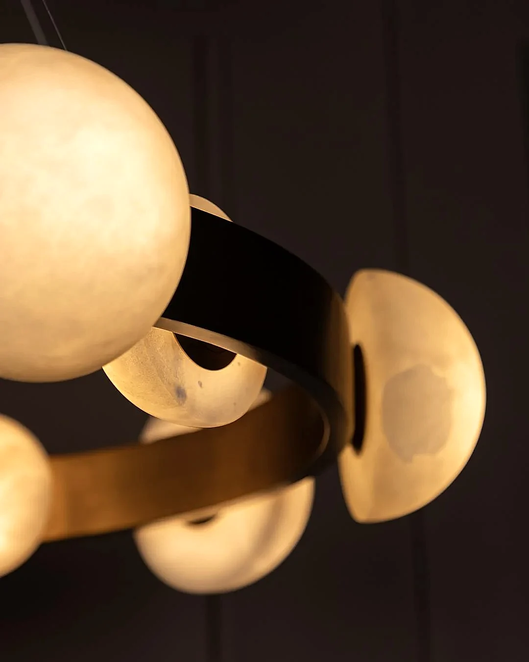 Hartum Avize, eskitme metal gövdesiyle birleşen doğal beyaz mermer detayları sayesinde zamansız ve sofistike bir tasarım sunar. Mermerin özgün damarları, her bir ürüne tekil bir karakter kazandırırken; yatay yerleşimiyle geniş salonlarda dengeli bir aydınlık sağlar. Modern çizgilerle klasik dokuları ustalıkla buluşturan bir formdadır.